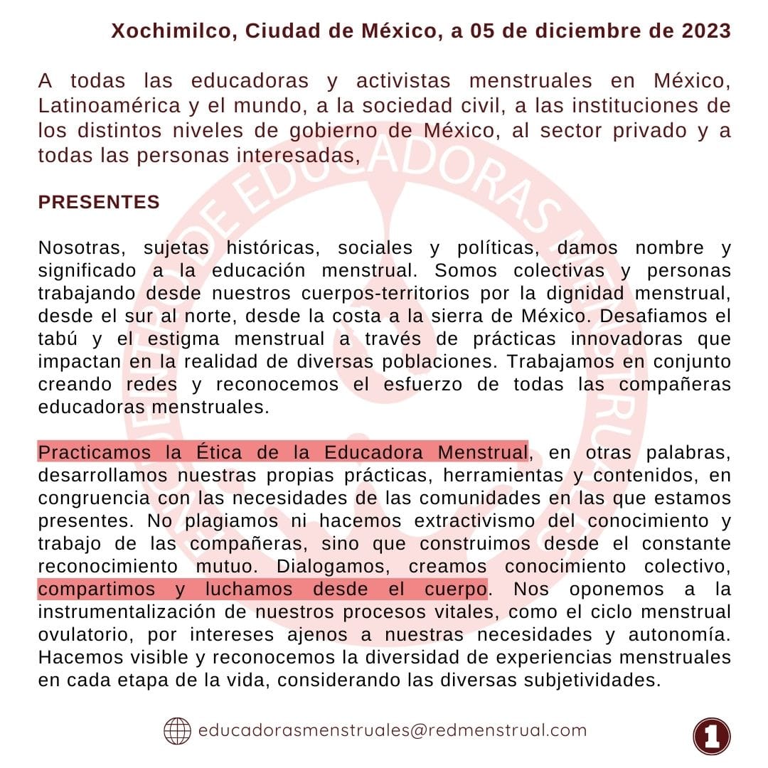 “Nuestra apuesta es por la justicia menstrual, por el reconocimiento, por el derecho al recurso público, para dignificar nuestro trabajo y va en contra de la feminización de la pobreza. Levantamos la voz porque estamos comprometidas con las niñas, adolescentes, mujeres y personas de la diversidad y las disidencias sexuales que menstrúan. Unimos esfuerzos por políticas públicas que nos representen y exigimos reconocimiento de la trayectoria y trascendencia de la Educadora Menstrual. Exigimos respeto por nuestro trabajo, que no se inmiscuyan intereses económicos del sector privado y partidista-clientelar en la implementación de la educación menstrual como un derecho humano”.