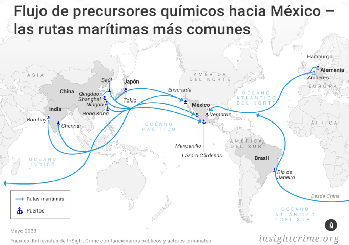 En cuanto a la ruta del fentanilo, en India y China se producen precursores químicos, mismos que son exportados a México para la síntesis de la droga (pueden llegar por vía aérea o marítima a nuestras costas), esto para que finalmente sean distribuidos en Estados Unidos.