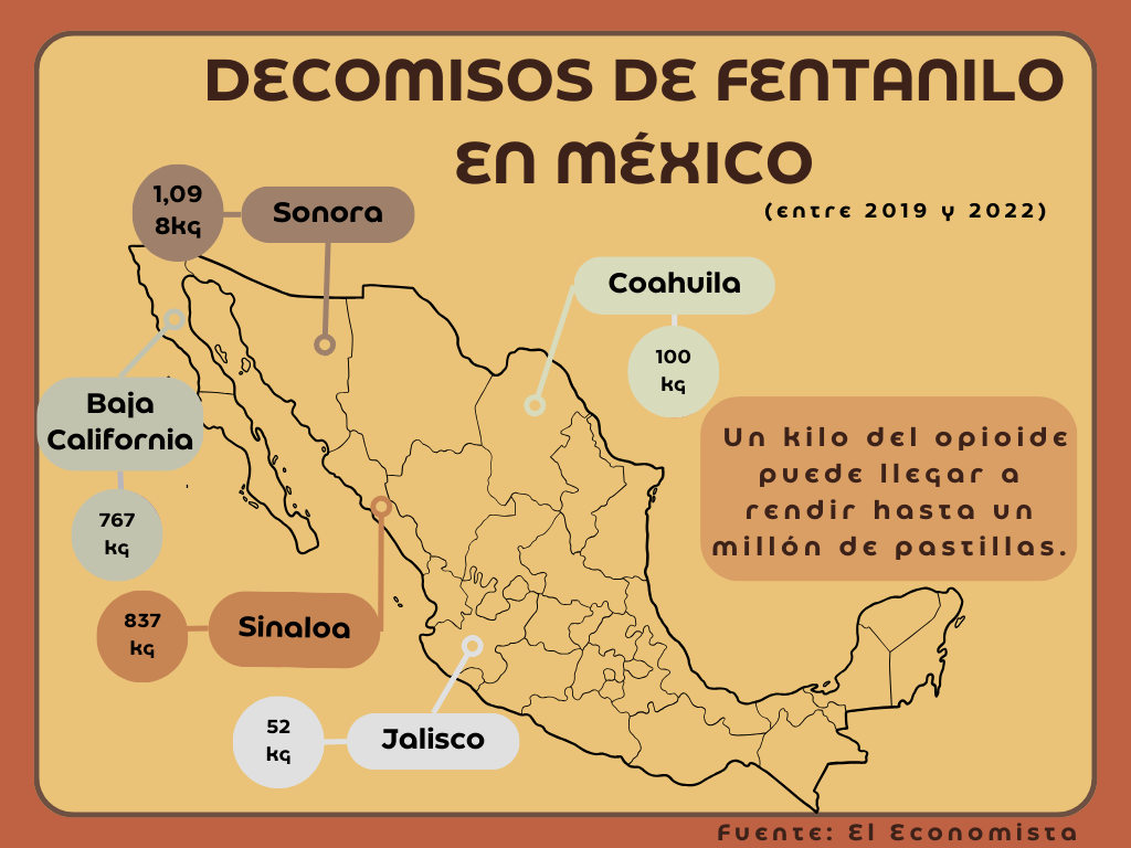 En contraste, según los datos de la Fiscalía General de la República (FGR) del 1 de enero de 2019 al 30 de junio de 2022, se han asegurado cerca de mil 694 kilogramos de fentanilo en nueve estados del país, así como 16 millones 307, 692 unidades de la misma droga.