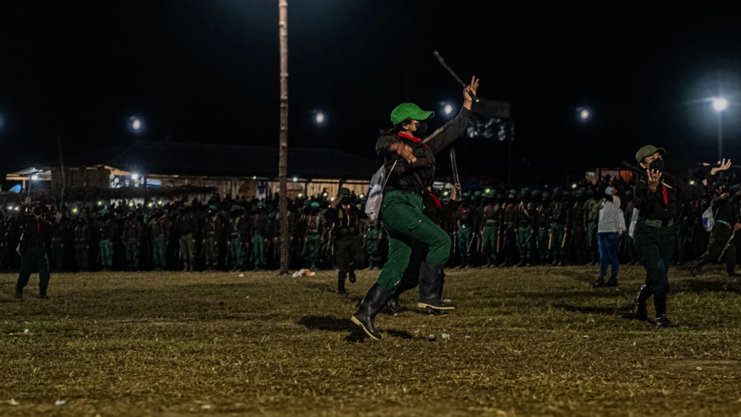Todo inició cuando el subcomandante Moisés se presentó en el podio, aproximadamente a las 11 de la noche. Con un sombrero negro de pescador, un pasamontañas oscuro y ojos que brillaban bajo las luces, exigió que los medios retrocedieran para dar paso a una marcha en el centro de la pista de baile. Cientos de milicianos y milicianas insurgentes marcharon al ritmo de los Ángeles Azules, demostrando su disciplina y poder sin armas, utilizando el arte y sus miradas como sus mayores herramientas.