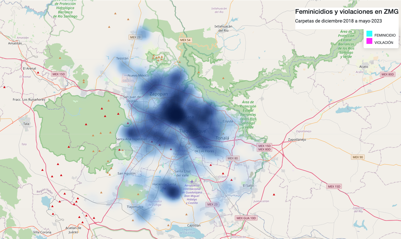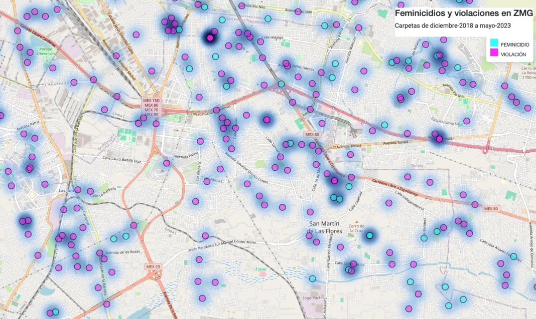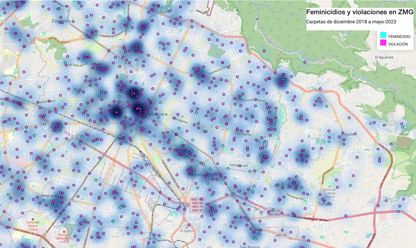 Con datos obtenidos en la Plataforma de Seguridad del Instituto de Información Estadística y Geográfica de Jalisco, Héctor Piña Camacho, periodista de datos, a través de un mapa georreferenciado expone que, entre diciembre del 2018 a mayo de 2023, cada 328.59 metros, tres cuadras aproximadamente, se cometen actos de violencia contra mujeres en la Zona Metropolitana de Guadalajara.