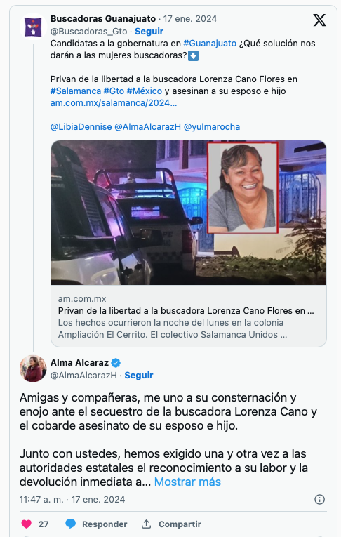 El mensaje lo acompañaron de la nota que publicó am sobre la desaparición de Lorenza Cano y el doble homicidio de su esposo e hijo. Sin entrar en detalles porque el Instituto Nacional Electoral restringe la promoción de propuestas a los tiempos de campaña, las tres respondieron durante la mañana de este miércoles.