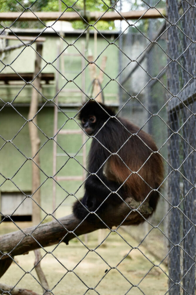 Así es como han llegado Bruno y Muk y otros 34 moños araña y saraguatos. A Bruno lo decomisaron en una cajuela de un carro en Calakmul, Campeche. A Muk lo encontraron aún abrazado de su madre muerta, presuntamente víctima de caza ilegal. Ambos venían con fracturas. También está Amperio, un monito que se electrocutó en un cable del que se colgaba, porque cada vez es más voraz el desarrollo urbano sin pasos de fauna. Amperio fue sometido a intervención quirúrgica y le amputaron dos extremidades. Es un caso particular porque él sí provenía de la vida silvestre, lo cual le benefició en el santuario porque se impone como alfa y se adaptó rápidamente.