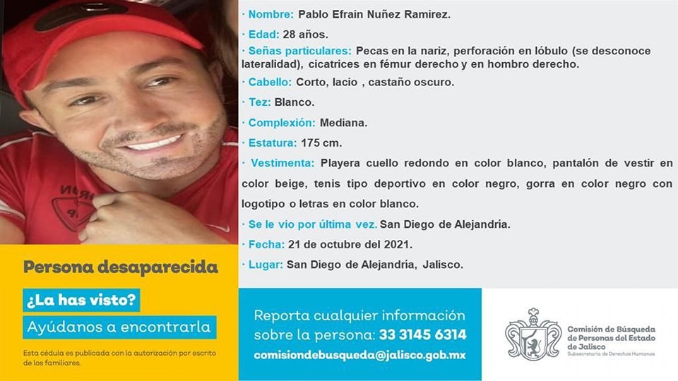 Otros casos registrados bajo la categoría de “Se busca reportante” son los de Efrén Alba Martín del Campo, quien fue desaparecido el 24 de marzo de 2020 en Encarnación de Díaz; Miguel Ángel Medina de Niz, desaparecido desde el 8 de febrero de 2018 en Autlán de Navarro; y Pablo Efraín Núñez Ramírez, quien fue desaparecido el 21 de octubre de 2021 en San Diego de Alejandría, de éste la Comisión de Búsqueda de Personas Desaparecidas de Jalisco sí emitió una ficha de búsqueda.