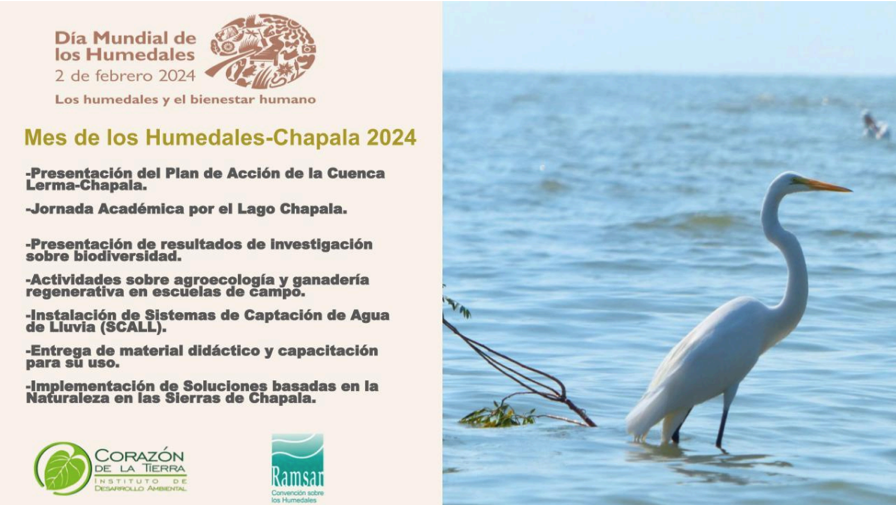 Frente a estos contextos, el Instituto Corazón de la Tierra convoca a conmemorar el Mes de los Humedales-Chapala, una iniciativa que tiene como propósito informar a la población sobre las condiciones del lago y su cuenca, además de dar visibilidad a las acciones de investigación, gestión y educación para su manejo adecuado.
