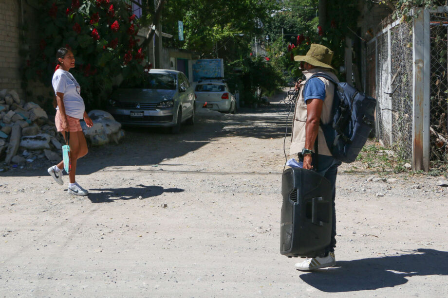 Decidido a encontrar nuevos alumnos, recorre las calles de tierra, bocina en mano y un micrófono: “Somos del INEA. Venimos a esta colonia para invitar a la población mayor de 15 años que no cuente con sus estudios de primaria o secundaria, a que se inscriban y terminen sus estudios”. El INEA es el Instituto Nacional para la Educación de los Adultos.