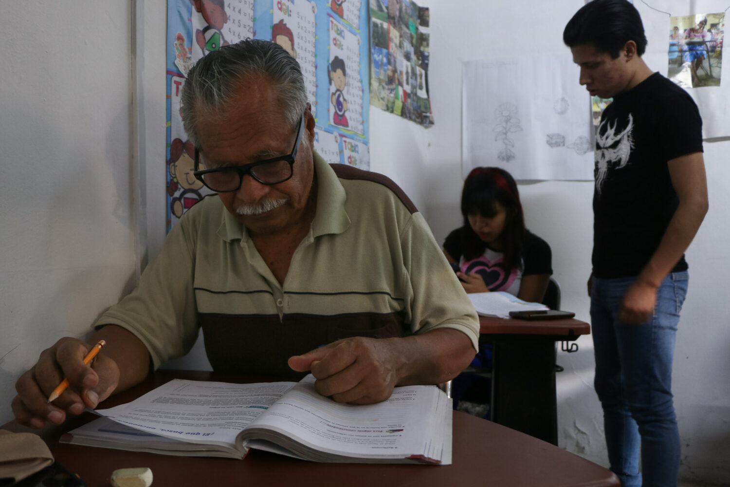 Roberto Núñez Gómez es otro alumno. A sus 78 años, cursa su preparatoria. “Escuché al maestro David Teliz Martínez en la radio. Dijo que la secundaria era completamente gratuita y me emocioné porque yo solo tenía la primaria”, recuerda. “Me gustó mucho la escuela porque he complementado los conocimientos que aquí me dan con mi experiencia. Mi meta es terminar la preparatoria y estudiar la carrera de psicología, por lo menos”.