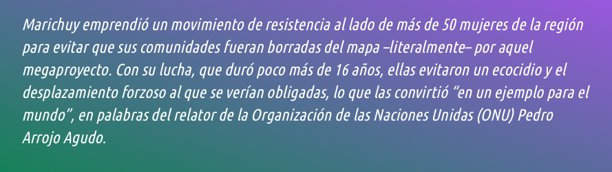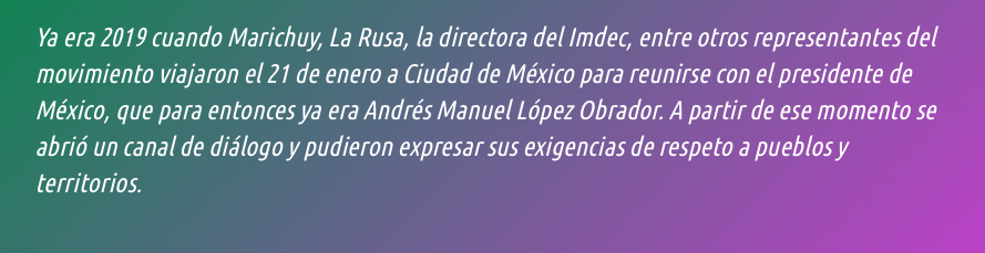 En ese encuentro realizado para intercambiar “estrategias de seguridad comunitaria y expresiones de resistencia desde las prácticas culturales”, Marichuy compartía las dificultades por las que atravesaban quienes participaban en la resistencia alteña. “Fueron con amenazas de querer sacarnos, de inundar el pueblo, y fue cuando nos empezamos a organizar, porque en primer lugar no fuimos consultados, y no hay derecho porque (…) la Constitución es para todos.