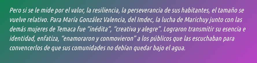 Las acciones de Marichuy y sus compañeras se extendieron hasta 2022. Pero el año clave para ellas y la gente que representaban fue 2021, cuando forzaron a las autoridades estatales al diálogo, se sentaron a la mesa de negociaciones con el gobierno federal y consiguieron modificar las dimensiones de la obra, de modo que la presa El Zapotillo funcionaría para los fines iniciales: llevar agua a varias zonas de Jalisco, sobre todo a la capital Guadalajara, sin inundar las tierras de Acasico, Palmarejo y Temacapulín, el cual, de paso, consiguió ser catalogado como Pueblo Mágico.