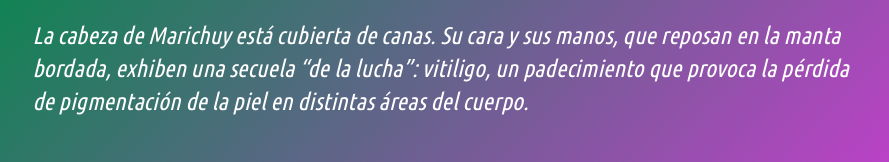 Ella lo explicó así al reportero Santiago Reyes de Corriente Alterna el 9 de abril de 2022, cuando atribuyó su enfermedad al estrés causado por la incertidumbre en que vivieron durante años: “Hubo muchos, muchos momentos de llanto –cuenta y muestra sus manos, señala las manchas–. Esto es de la lucha”.