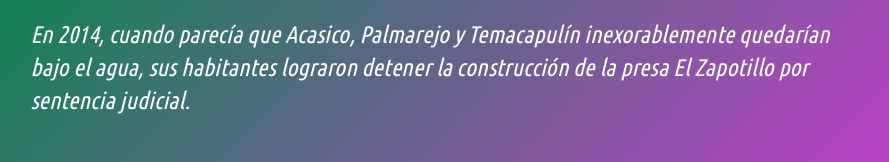 Lo iban a desaparecer, junto con otros dos pequeños poblados del municipio de Cañadas de Obregón, en la zona de los Altos de Jalisco. El gobierno de ese estado situado al occidente de México había comenzado la construcción de la presa El Zapotillo en el río Verde, que inundaría a Acasico, Palmarejo y Temacapulín, sin consultar a los cientos de personas que resultarían afectadas.