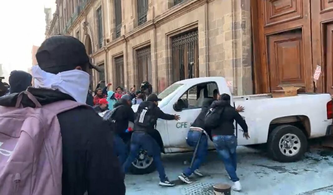 Estudiantes de Ayotzinapa derribaron la puerta 1 de Palacio Nacional, en pleno desarrollo de la Mañanera. Las madres y padres intentaban entregar para entregar un documento a AMLO y reiterar su solicitud de diálogo.