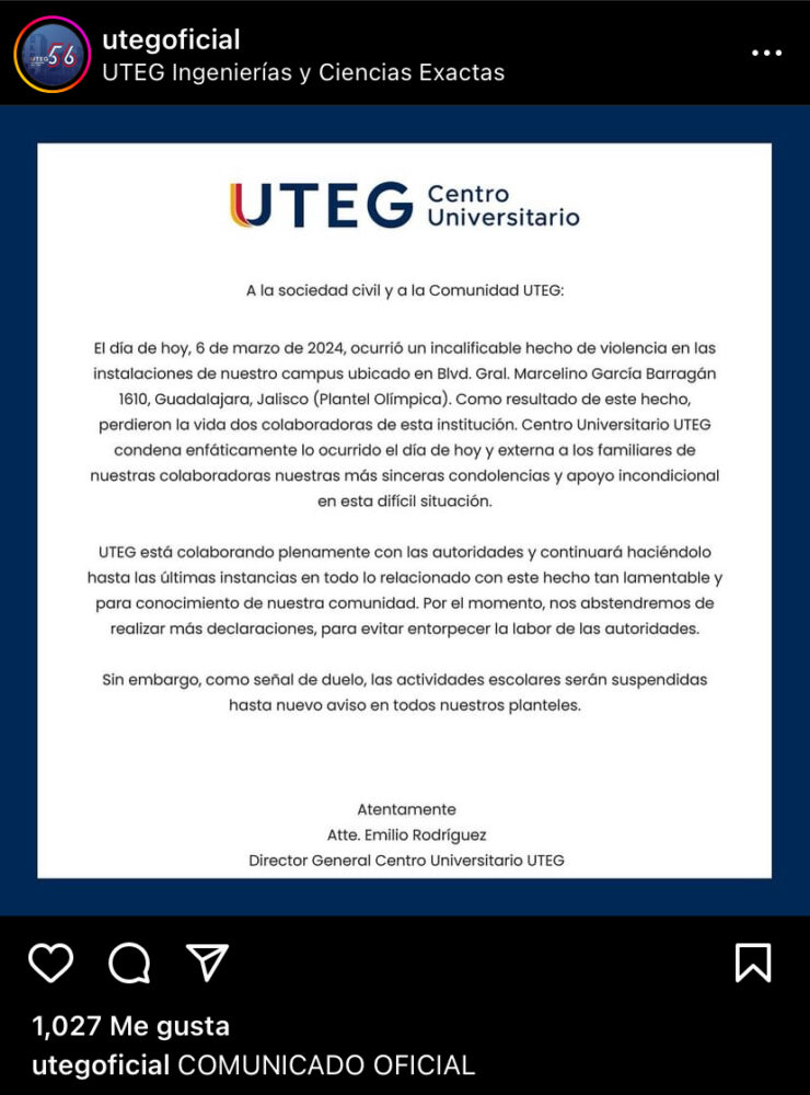De parte del Centro Universitario UTEG se emitió un comunicado oficial en el que señalan que lamentan los hechos, además anunciaron que en señal de luto suspenderán las clases en todos sus planteles, esto hasta nuevo aviso.