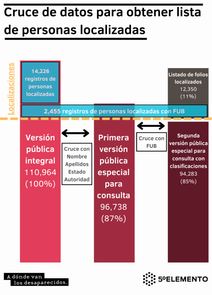 Después se confrontó la segunda “Versión pública especial para consulta del RNPDNO”, que incorporaba las clasificaciones del censo de AMLO, con la “Versión pública integral del RNPDNO” del 23 de agosto de 2023, con 110,964 registros que incluían las localizaciones, pero sin FUB. Para este cruce se utilizaron los nombres, apellidos, el estado donde ocurrió la desaparición y la autoridad que hizo el reporte. Así se obtuvieron 9,619 nombres de personas localizadas.