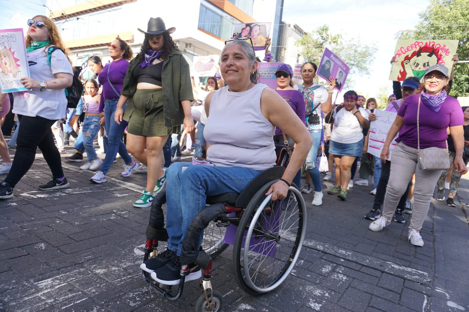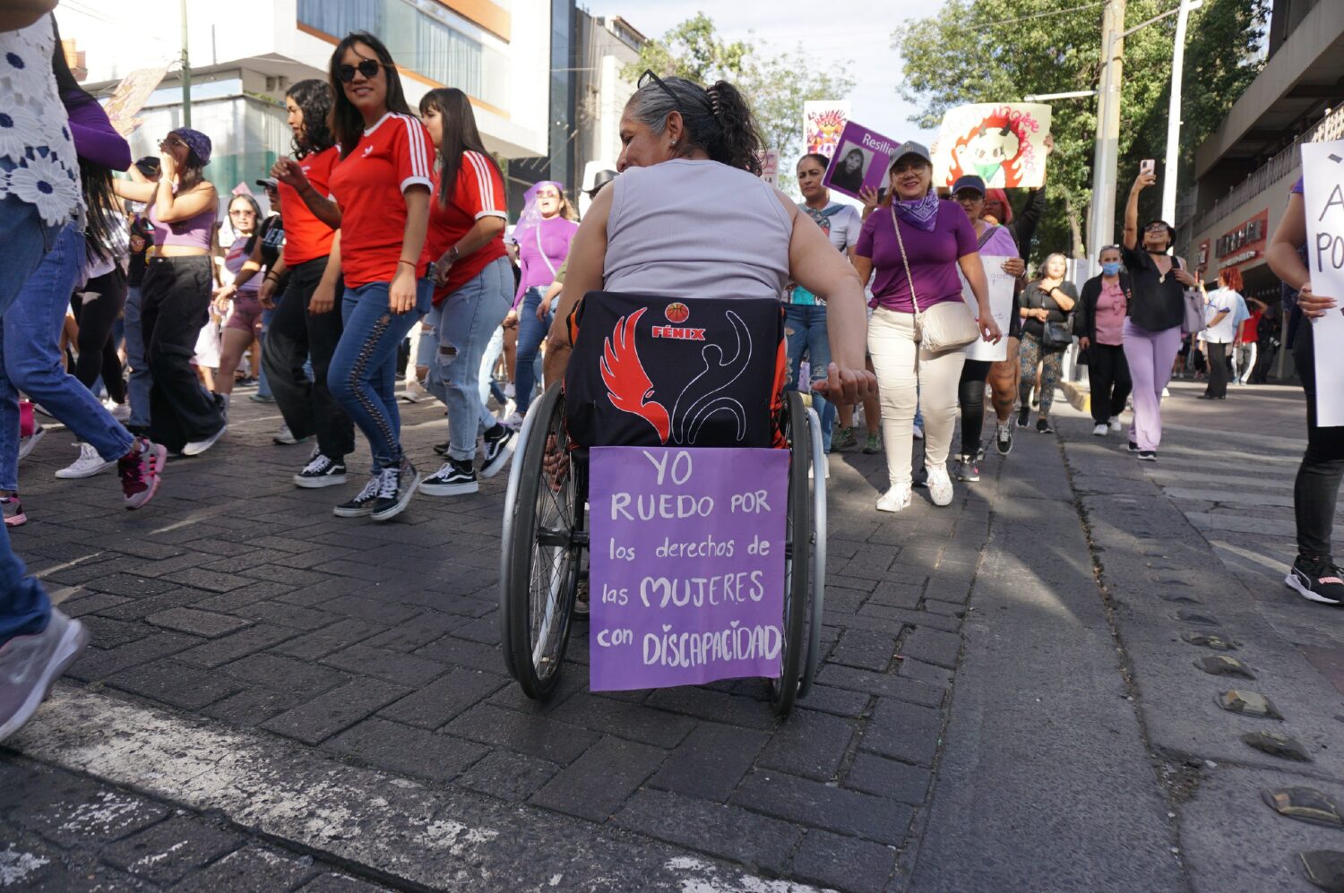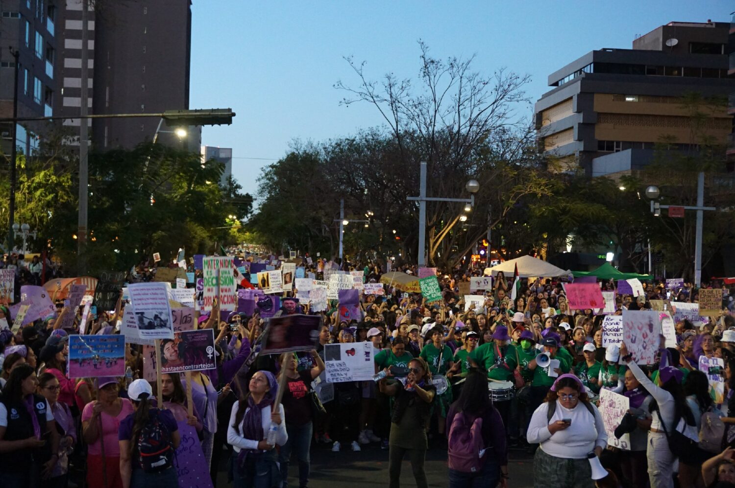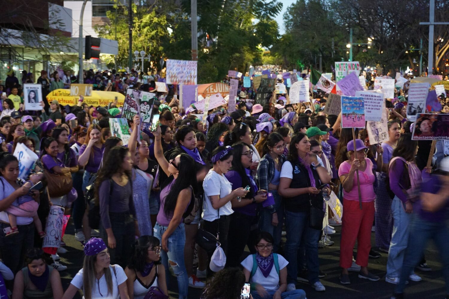Marcharon mujeres con discapacidad y anticapacitistas; ecofeministas representadas por la Red de Defensoras Jalisco; feministas antiespecistas; maestras feministas que luchan en contra de las violencias escolares y por sistemas educativos organizadas a través de la Red de Maestras Feministas; infancias y adolescencias. Salieron a las calles también lxs cuerpxs disidentes; lxs gordxs; personas trans; personas con capacidad de gestar; las colectivas que trabajan por la soberanía menstrual; lxs psicologuxs feministas; la comunidad de mujeres de Palestina para exigir alto a la guerra; las madres; las madres y familias que buscan a sus amores desaparecidxs y a quienes reclaman justicia por las hijas que les fueron arrebatadas tras un feminicidio.