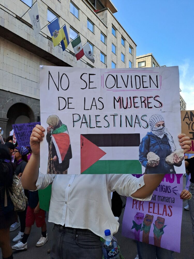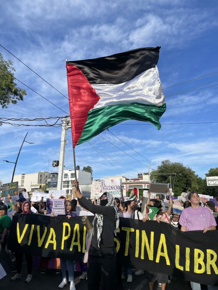 “Resistimos juntas con la solidaridad y la ternura que nos impide ser indiferentes ante el dolor de las personas, que hoy, alrededor del mundo están sufriendo y están siendo sometidas por la ambición y la dominación de los regímenes genocidas, racistas, patriarcales, capitalistas, y colonialistas” Pronunció el comité de solidaridad con Palestina en el marco del #8M en Guadalajara.