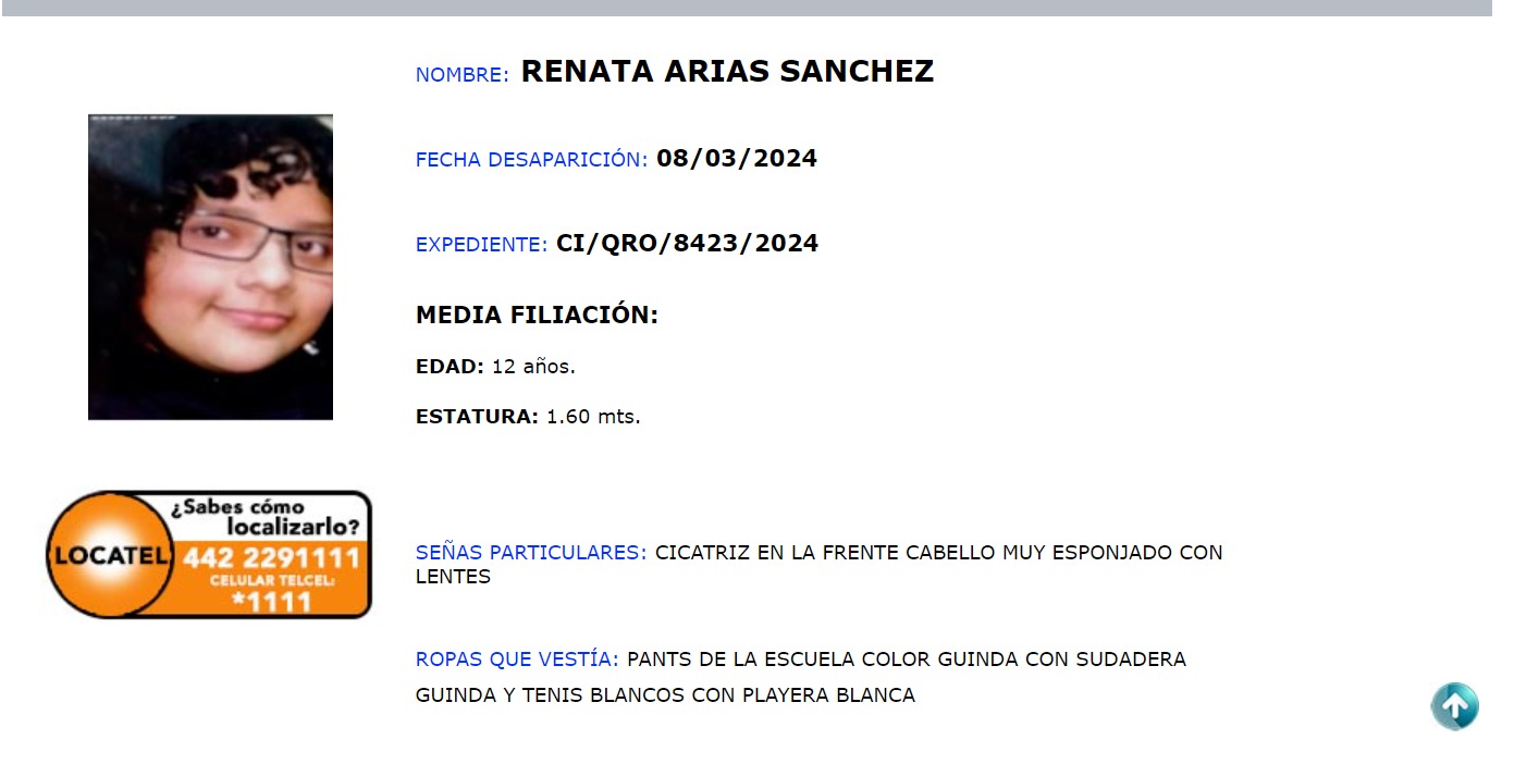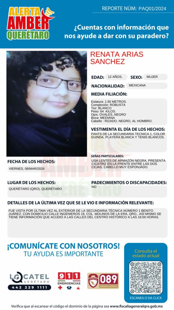 Desde el pasado viernes 8 de marzo, Renata Arias Sánchez, de 12 años, no ha sido localizada por sus familiares, por lo que este domingo fue activada una Pre-Alerta Amber. La menor fue vista por última vez el viernes al exterior de la Secundaria Técnica Número 1 “Benito Juárez”, en la capital de Querétaro, institución en la que estudia.