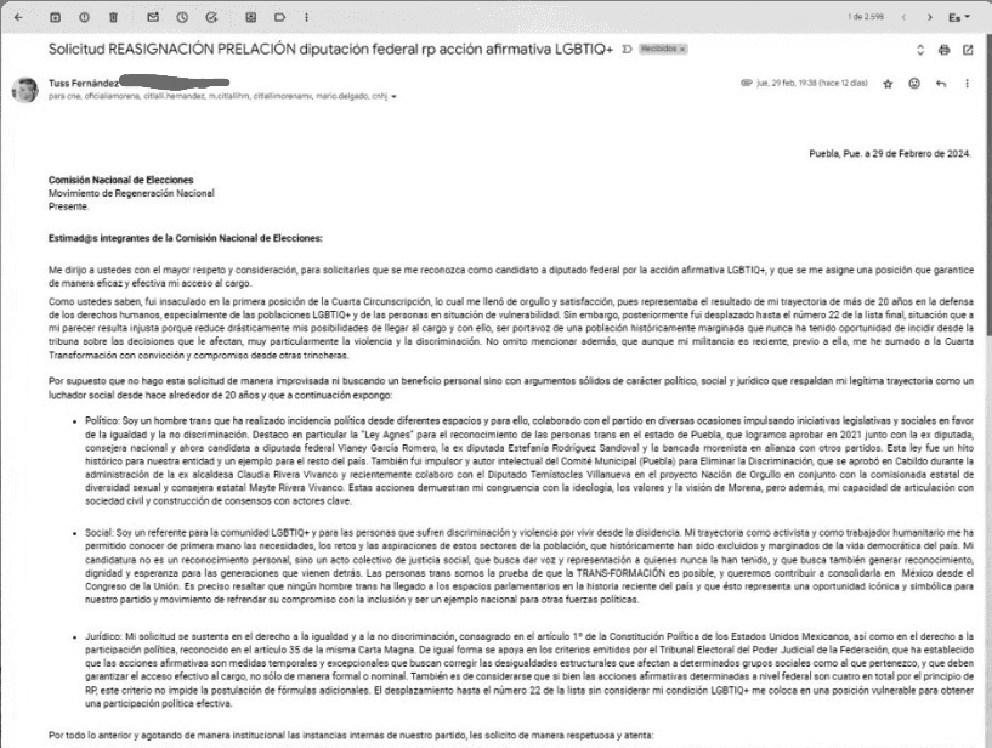 Tampoco tuvo respuesta al mail que envió pidiendo, nuevamente su reconocimiento como hombre trans y que se considerara su trayectoria en el activismo por la diversidad sexual para que fuese reubicado en la lista de acuerdo con los lineamientos del Instituto Nacional Electoral en una posición competitiva.