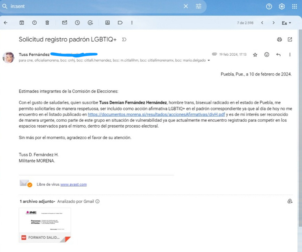 Ahí vino, además, una segunda violación a su identidad de género: fue registrado como hombre cis. Una conclusión a la que llega Tuss Demián pues explica que su compañero de fórmula, su suplente, no ha hecho pública una identidad diversa. Tampoco aparece en los listados de personas que se inscribieron al proceso interno del partido en la categoría de Acción Afirmativa LGBTI+.