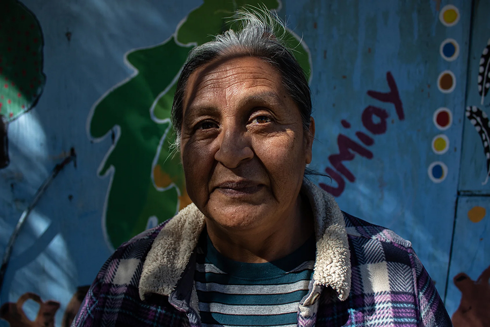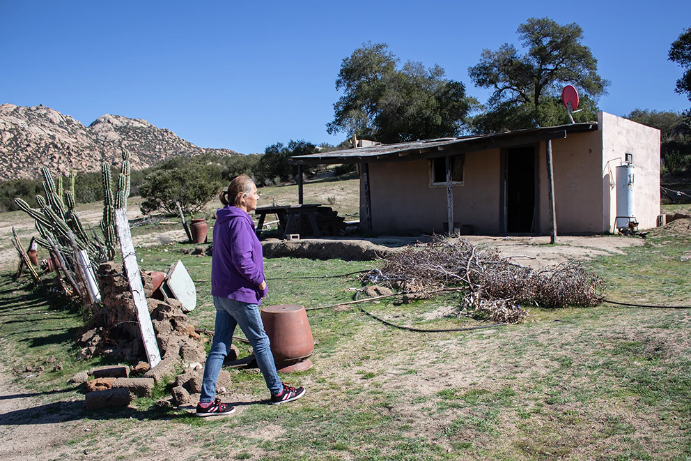Óscar, de 34 años, se interesó por los movimientos sociales a través de su tía, Yolanda Meza Calles, que vive unos kilómetros adelante. En los tablones de la pared trasera se lee la pintada ‘Rancho Meskuich’, su apellido en lengua originaria; una declaración de intenciones. La corpulenta indígena de tez cobriza, densa melena canosa, jeans y chaqueta de cuadros, es una de las pocas —si no la única— defensoras de la etnia kumiai.