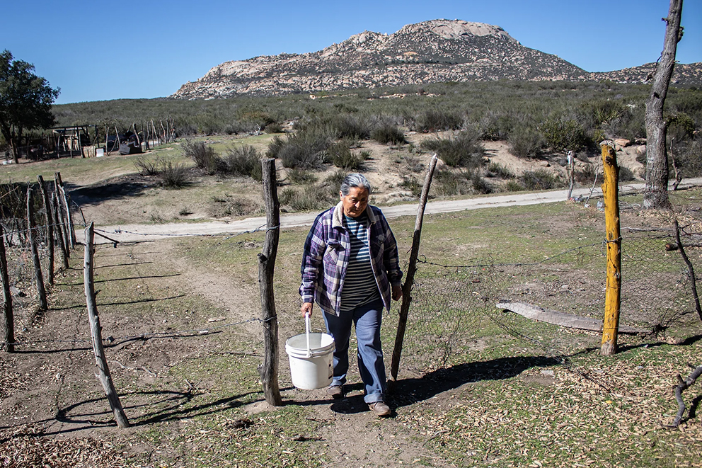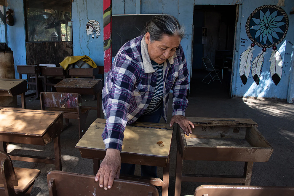 El latón sobre nuestras cabezas es uno más de la larga lista de problemas que sufre la comunidad. Sus alumnos del Centro Cultural de Tijuana, donde es profesora de kumiai desde hace siete años, acaban de organizar una colecta para tapar los agujeros. La modesta huerta de ajos en su patio no le da lo suficiente para contratar internet, así que cada dos sábados va a Tijuana a impartir su clase. Los estudiantes se turnan para recogerla el viernes y regresarla el domingo. Entre semana lleva a sus nietos al colegio en Santa Verónica, a doce kilómetros de trocha, y se espera todo el día a que salgan, porque no puede pagar la gasolina para ir y volver tantas veces.