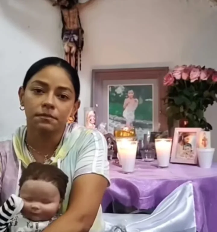 En el fondo se visualiza un pequeño altar de la menor con una fotografía grande, velas y flores rosas.