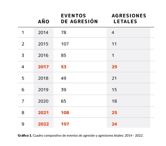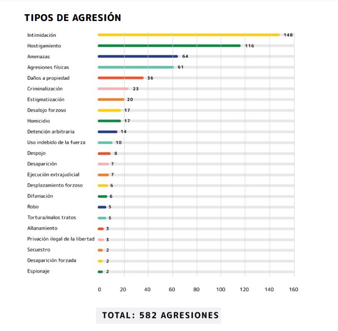 Entre los tipos de agresiones más comunes se encontraron las amenazas, el hostigamiento, el acoso, la difamación, la criminalización, el desplazamiento forzado y el asesinato.