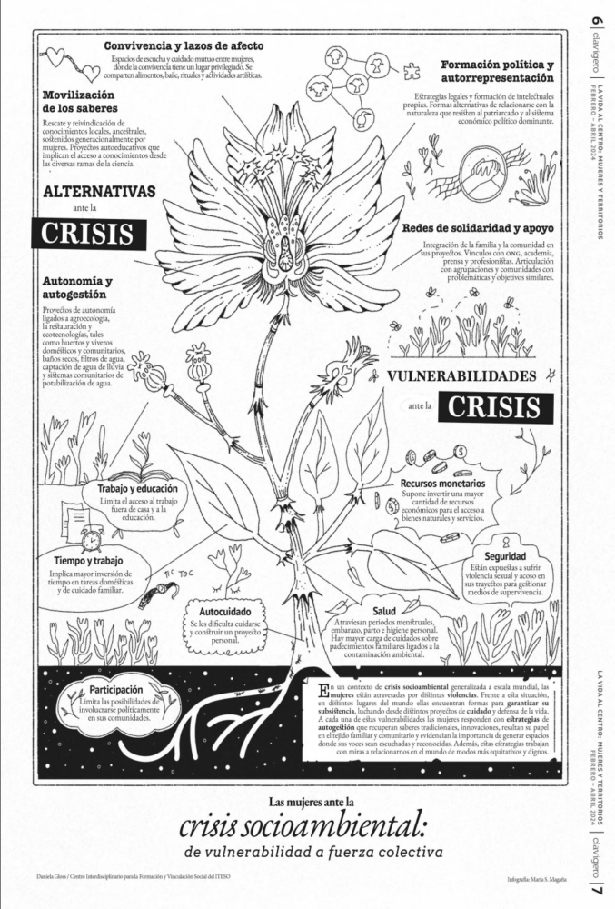 Como parte de las actividades en el marco mundial del Día de la Tierra, la revista Clavijero presentó su edición número 31 (febrero – abril 2024), enfocada en el trabajo de las mujeres defensoras del territorio en diversos contextos dentro de Jalisco. La publicación resalta su liderazgo y su papel activo en las luchas por la protección y cuidado de la vida y evidencia las distintas vulnerabilidades que les atraviesan como resultado de la violencia de género; desde afectaciones medioambientales hasta la participación política.