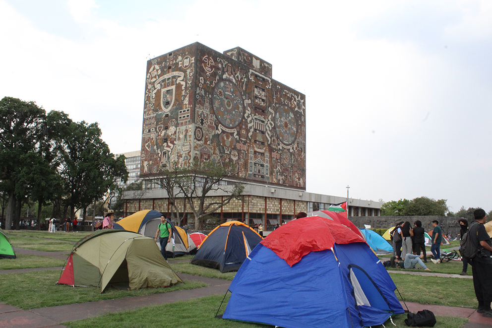 CIUDAD DE MÉXICO. – Entre la Biblioteca Central y la Rectoría de la Universidad Nacional Autónoma de México, estudiantes, trabajadores y académicos colocaron un campamento indefinido, como parte de las acciones globales que miles de universitarios de todo el mundo llevan a cabo en solidaridad con el pueblo palestino.