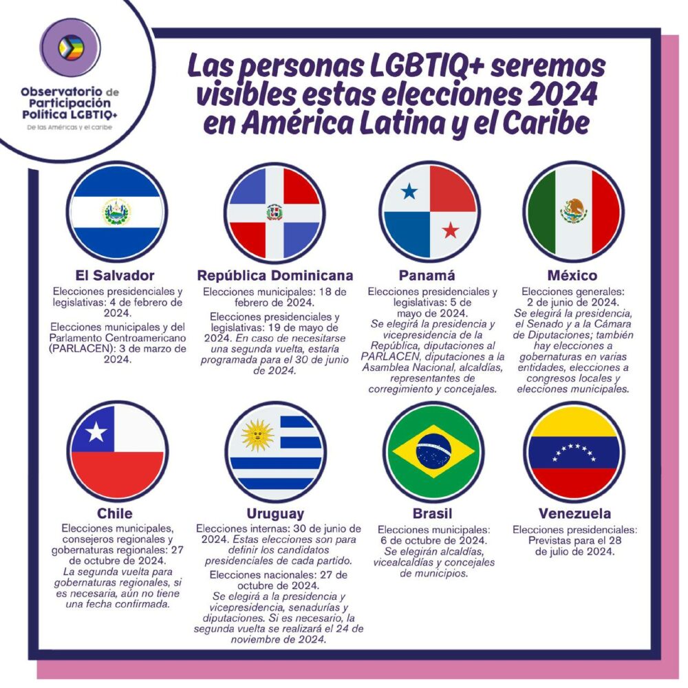 Durante el 2024, ocho países de América Latina y el Caribe han tenido o tendrán elecciones; sin embargo, no en todos los casos las personas LGBTIQ+ fueron o son tomadas en cuenta como sujetxs de derechos políticos; por ello, las organizaciones LGBTQ+ Victory Institute (Estados Unidos), Corporación Caribe Afirmativo (Colombia), Yaaj Transformando tu Vida A.C. (México), Centro para el Desarrollo y la Cooperación LGBTI SOMOS CDC (Honduras), Diversidad Dominicana (República Dominicana) y PROMSEX, Centro de Promoción y Defensa de los Derechos Sexuales y Reproductivos (Perú) crearon el “Observatorio Regional sobre la Participación Política de las personas LGBTIQ+ en América Latina y el Caribe”, la idea y acción colectiva es dar seguimiento a las experiencias de candidaturas abiertamente LGBTIQ, así como “monitorear el contexto de violencia política y amenazas a los derechos humanos de la comunidad de la diversidad sexo-genérica”.