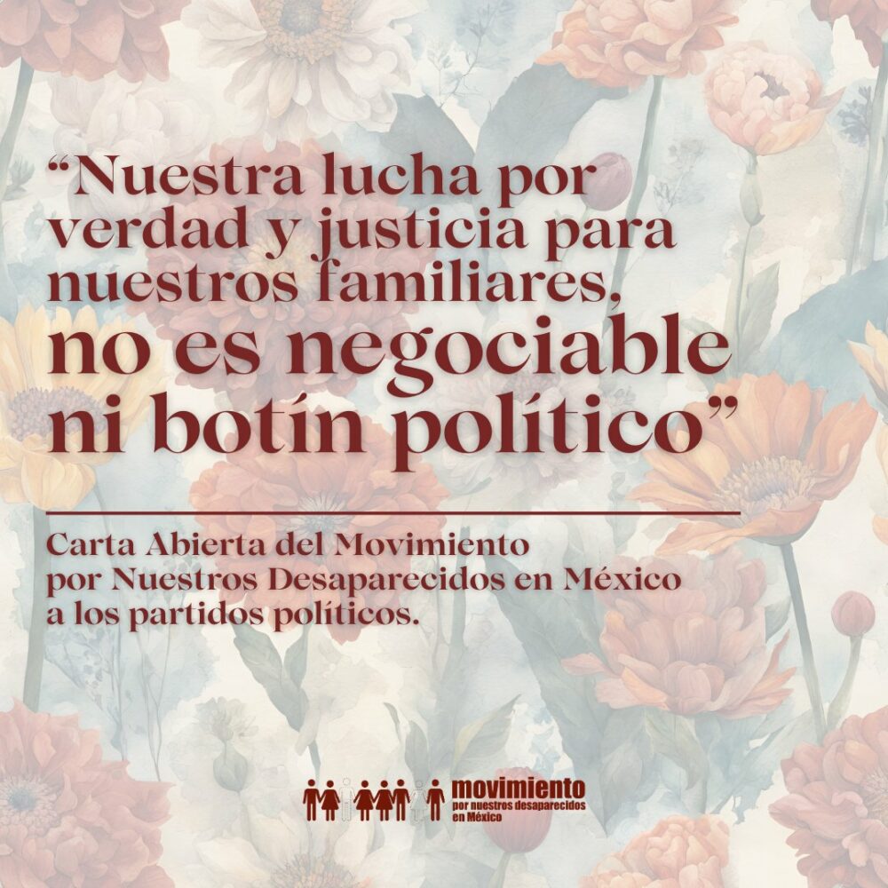 En el marco del 10 de mayo, Día de las Madres, el Movimiento por Nuestros Desaparecidos emitió una carta abierta a todos los partidos políticos para que asuman un compromiso real en la búsqueda de sus amores desaparecidos.