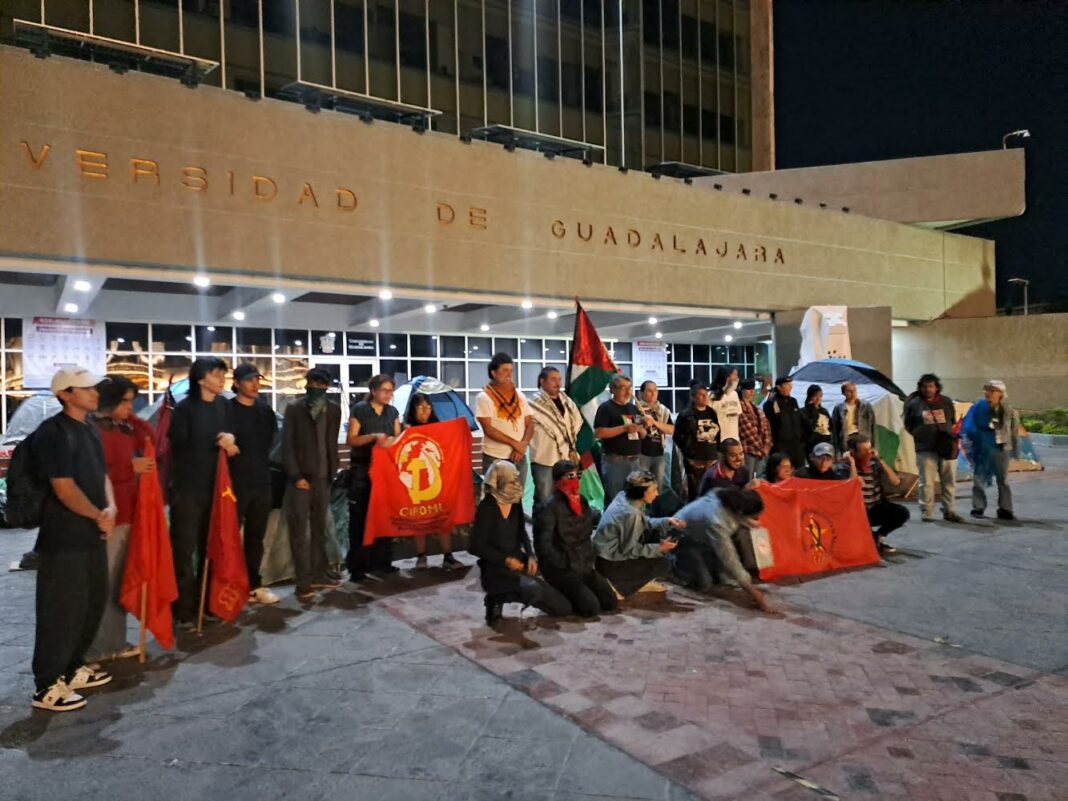 La marcha recorrió las Avenidas Alcalde y Juárez hasta llegar a las instalaciones de la rectoría de la Universidad de Guadalajara donde acamparon y pernoctaron para exigir a la Rectoría que se pronuncie en contra del genocidio contra el pueblo palestino.
