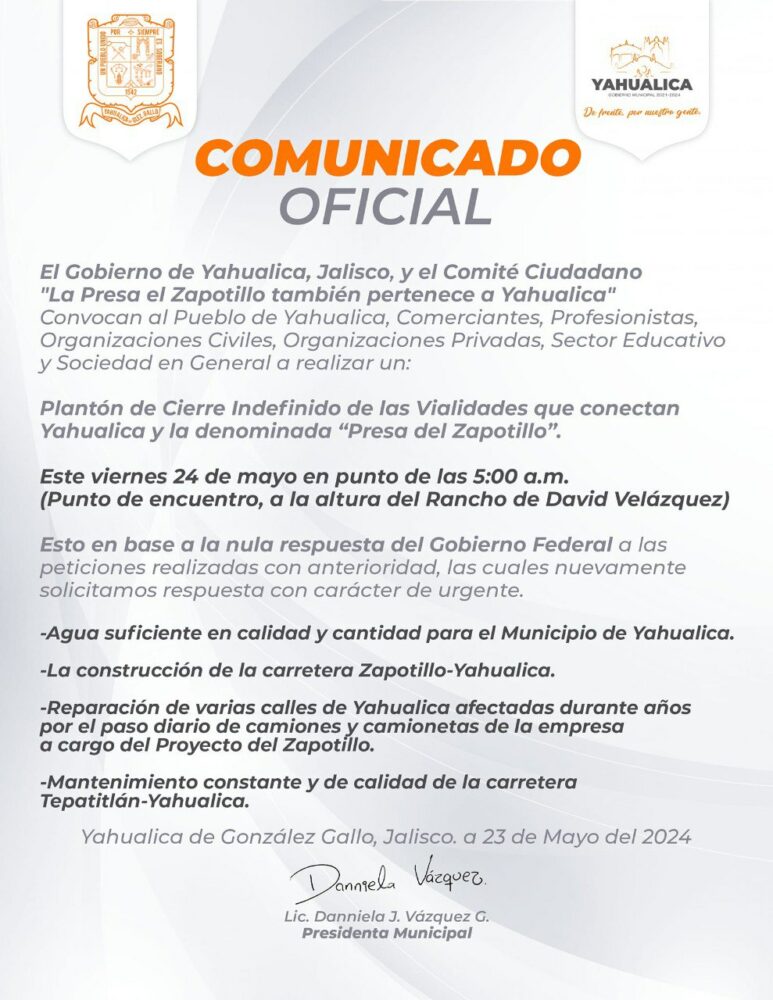 El municipio de Yahualica, a através de un comunicado firmado por la presidenta municipal Danniela J. Vázquez, convocó a un plantón de cierre indefinido de las vialidades que conectan Yahualica y la presa El Zapotillo.
