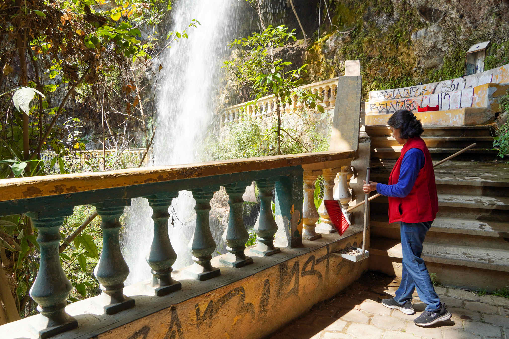Como cada mañana de domingo, Alberto Navarro toma su escoba para limpiar una cascada de escalinatas tupida de vegetación. Barre las hojas secas de decenas de escalones separados por andadores largos y maltrechos. Su esposa, Maricela Rodríguez, y su hermana, Diana Navarro, tienen a la mano escobas, recogedores y bolsas de plástico. Uno a uno, barren los 190 escalones, juntan hojas secas de árboles, botellas de plástico y otros residuos. Les lleva dos horas y media limpiar las instalaciones turísticas que rodean la cascada El Salto de San Antón.