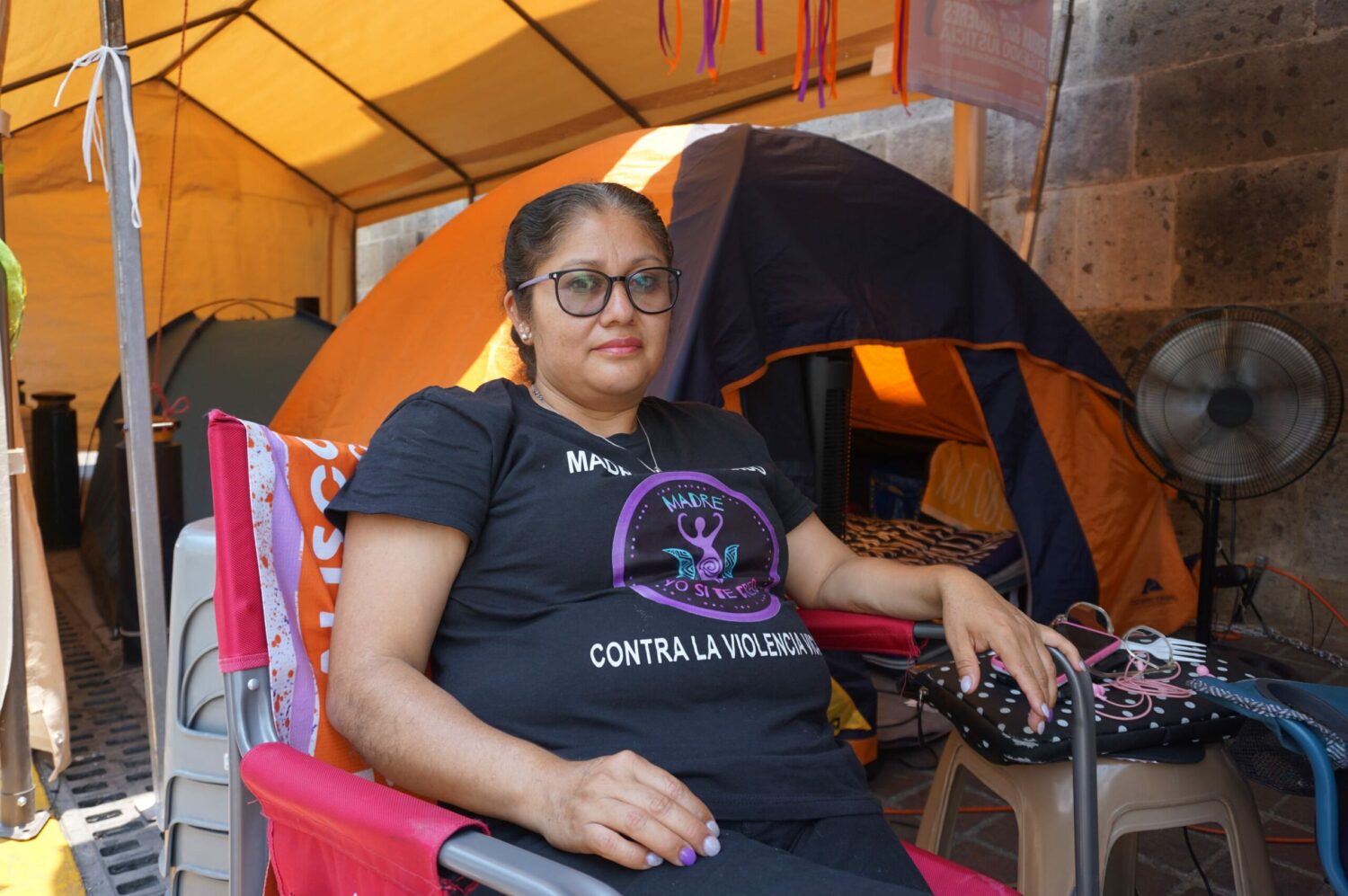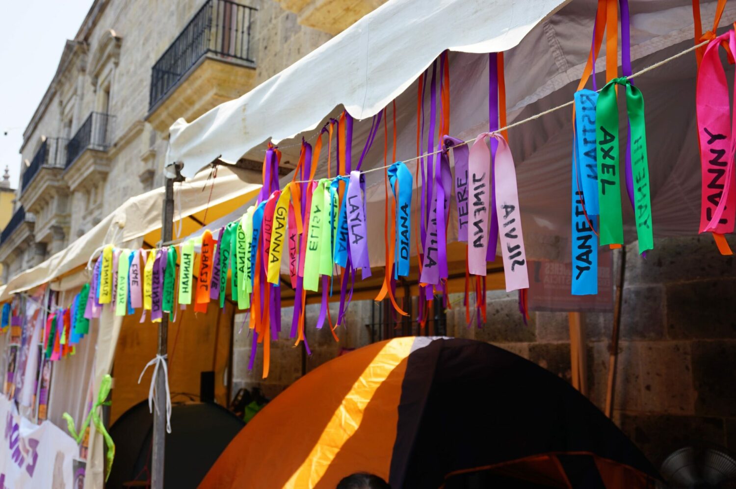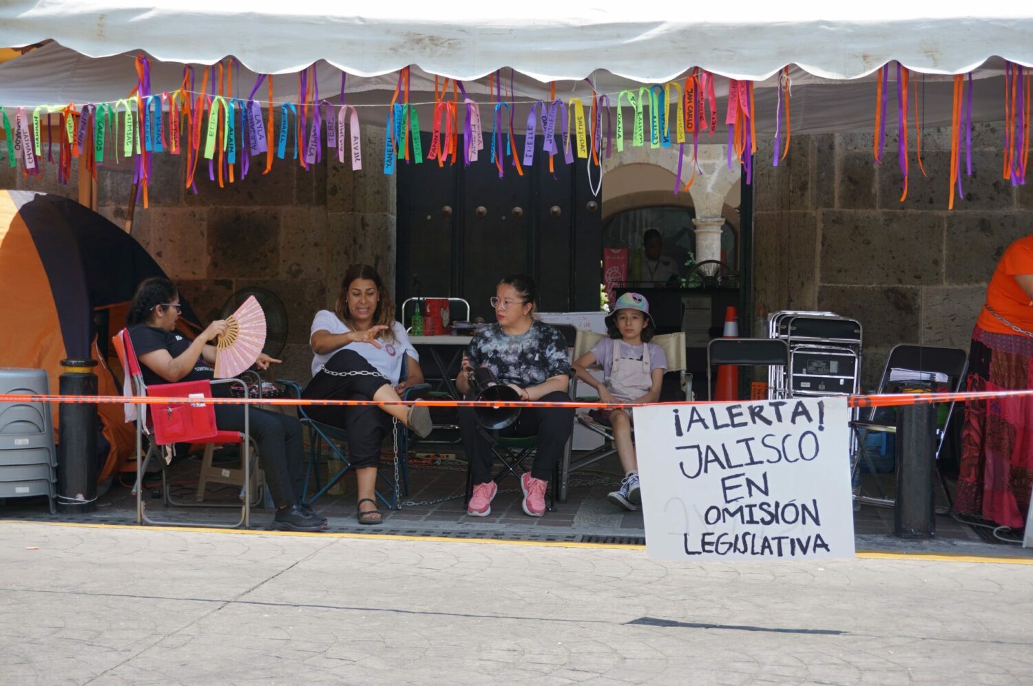 Así, cumplidas las primeras 48 horas de huelga de hambre movilizaron su plantón junto al de sus compañeras, sobre la calle Hidalgo, a las puertas del Congreso de Jalisco. Colocaron sus casas de campaña, los ventiladores que utilizan para soportar el calor que a veces superar los 38 grados centígrados en el Área Metropolitana de Guadalajara, sus botellas de suero y agua, que les han regalado las dependencias y personas solidarias y, por supuesto, el tendedero de listones con los nombres de todas las infancias -sus hijas e hijos- que les han arrebatado.