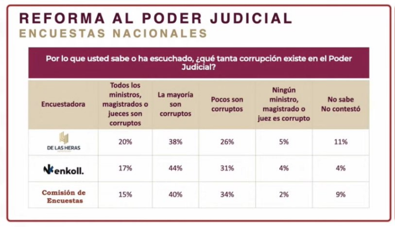 Entre el 77 y 83 por ciento de la población está de acuerdo con que el Poder Judicial es corrupto, que necesita ser reformado y que los ministros de la Suprema Corte de Justicia de la Nación, quienes encabezan este Poder, deberían ser electos mediante el voto, según tres encuestas realizadas por Morena durante este fin de semana.