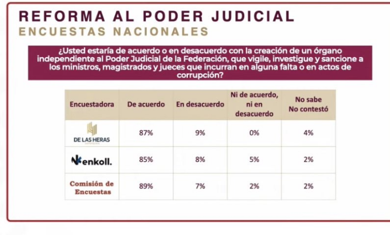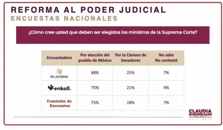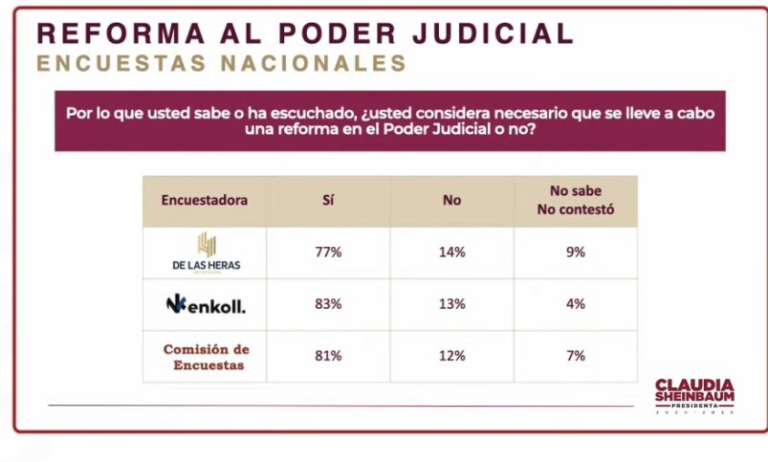 La virtual presidenta electa, Claudia Sheinbaum, presentó los resultados de las encuestas que organizó Morena sobre la pertinencia de una Reforma al Poder Judicial; la gente avala la propuesta de López Obrador. La propuesta es que esta reforma se discuta en todo el país, por lo que el Poder Legislativo ya prepara el formato