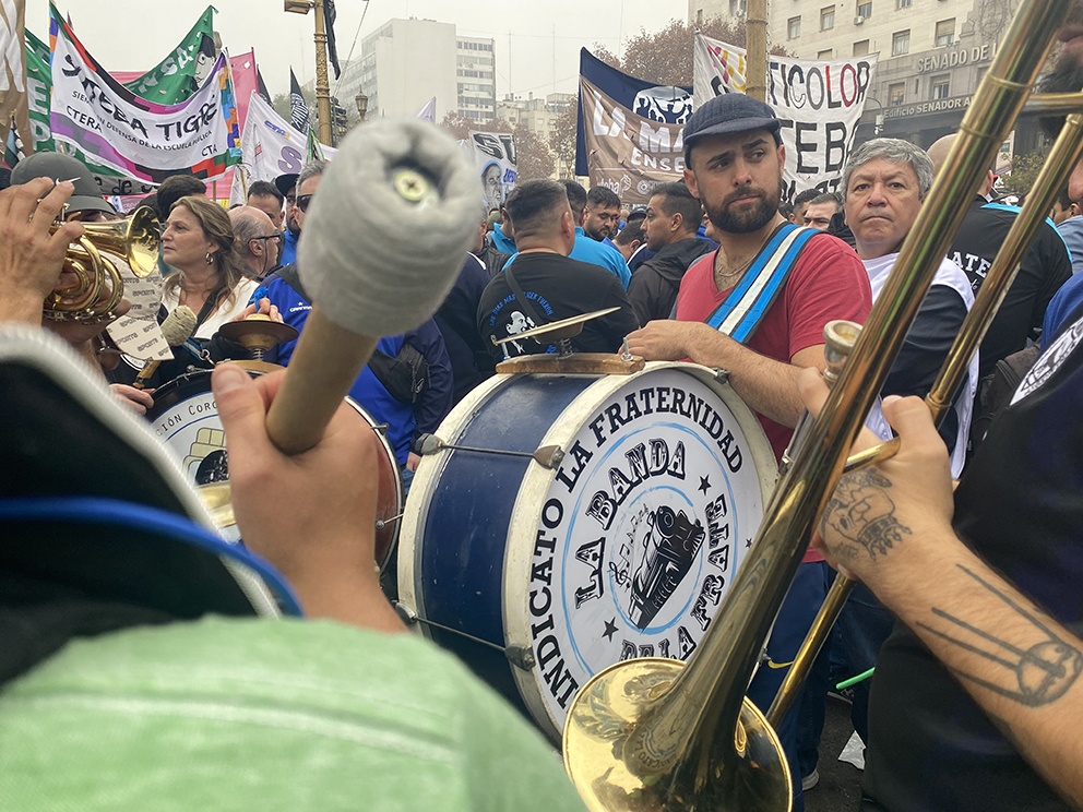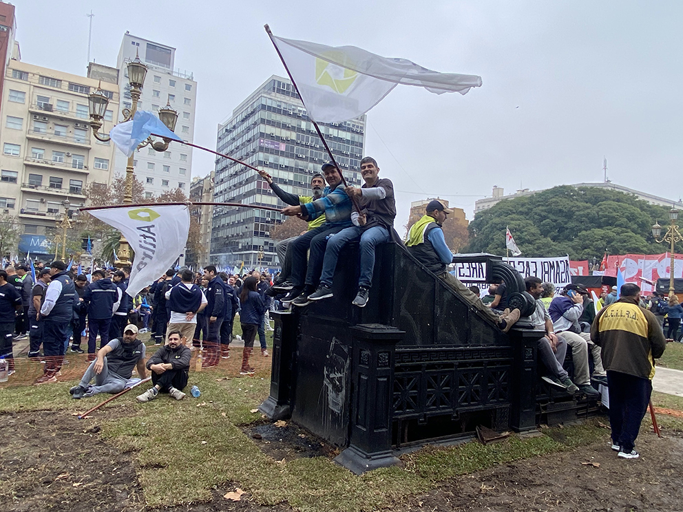 Los grandes sindicatos se concentraron en el inicio de la Plaza Mariano Moreno. La gente seguía llegando. Resolví dar una vuelta, pensé en preparar algunas entrevistas: jubilado, empleada de Aerolíneas Argentinas, representante de Trenes de Argentina, líder del Sindicato de Actrices y Actores. Caminé buscando fotos, mirando, escuchando. En los altavoces advertían de no caer en provocaciones del cuerpo de policías. Aproximadamente a las dos de la tarde los sindicatos comenzaron a salir del frente de la plaza. La gente seguía, los puestos ambulantes de choripanes de pronto tenían filas. Agua, refrescos, cervezas, fernet, dulces. Las personas sostenían mate y todo parecía tranquilo.