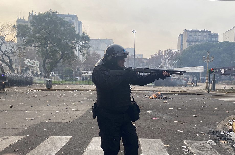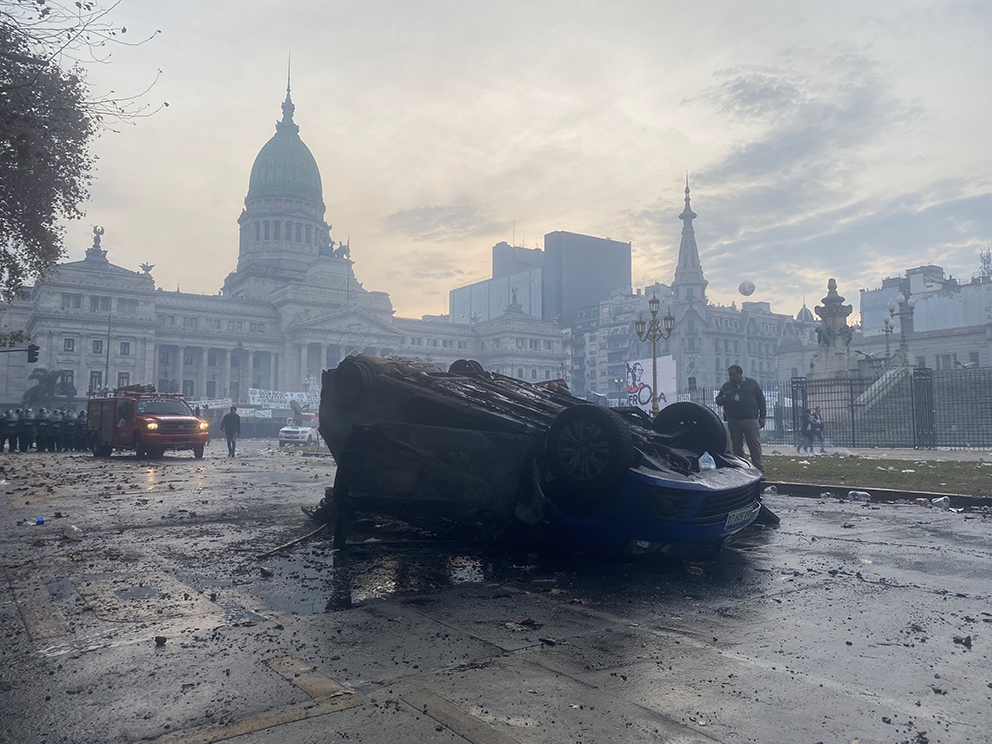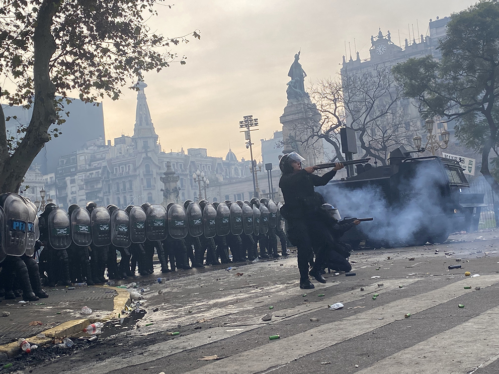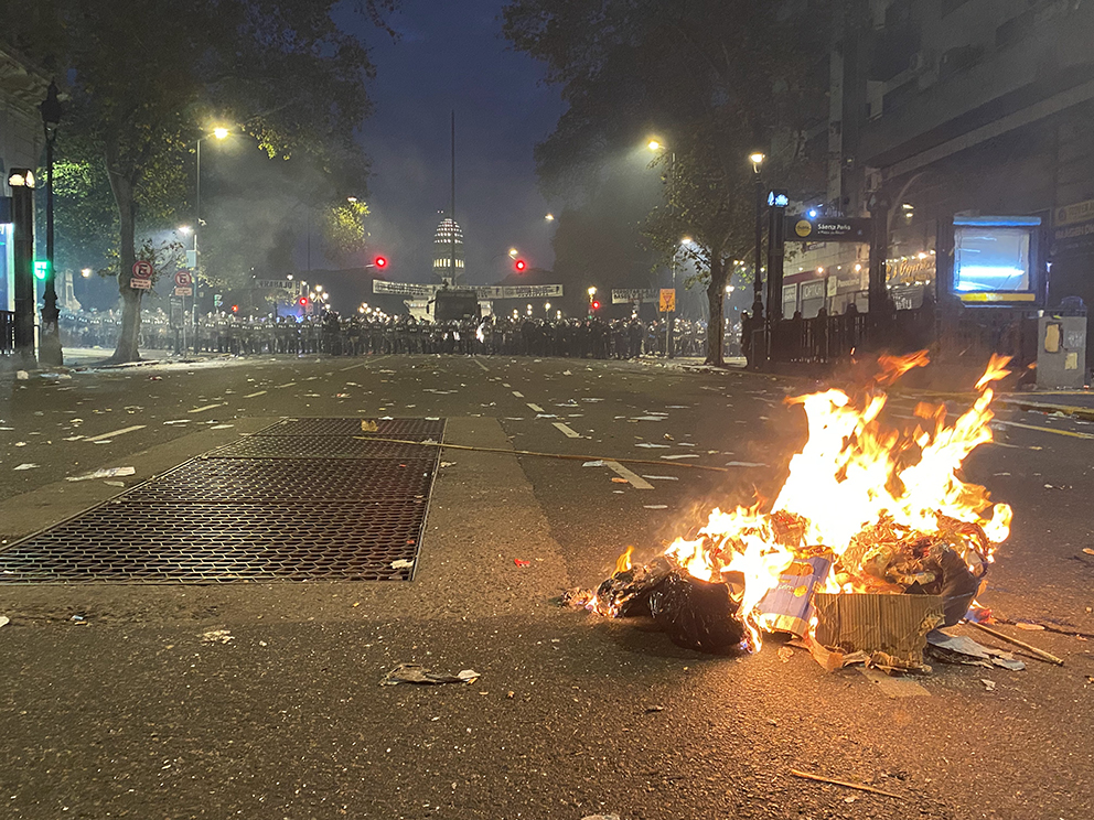 Dejé el frente para caminar y ver hasta donde llegaban los contingentes, fui poco a poco, tomaba fotos. Los alrededores estaban plagados de gente. Salí de la protesta para buscar un lugar donde cargar el teléfono. Menos de una hora estuve fuera. Regresé siguiendo el Google maps, me llevó a la Avenida Hipólito Yrigoyen y Solís, justo donde un automóvil de Radio Cadena 3 fue incendiado. Imagen que le dio la vuelta al mundo. El Senado seguía en sesión. Al teléfono mensajes de mis amigas argentinas diciéndome que me alejara de la zona del Congreso, que había gases y enfrentamientos, pero yo estaba ahí, entre un carro en llamas y fuerza policiaca desmedida. En cuestión de minutos la policía logró entrar por la calle del lado de la plaza (Hipólito Yrigoyen) y acercarse a la gente que seguía en la manifestación. Me encontré entre fotógrafos que estaban cubriendo la marcha, llevaba una cámara al hombro que se me ocurrió cargar, al final era una turista más. Me integré al grupo de periodistas, alguno me preguntó —¿de dónde sos?. —Mexicana, le respondí. Nos quedamos parados por un momento en la esquina sintiéndonos medianamente protegidos por los otros fotógrafos que seguían registrando cada uno de los ángulos de un policía que una vez que disparaba marcaba una genuina y clara sonrisa.