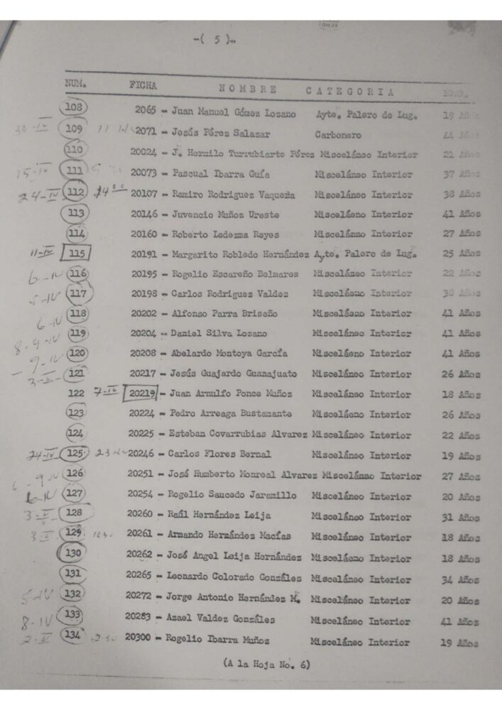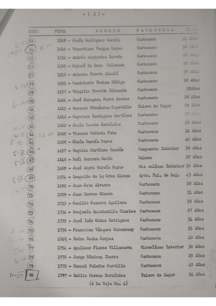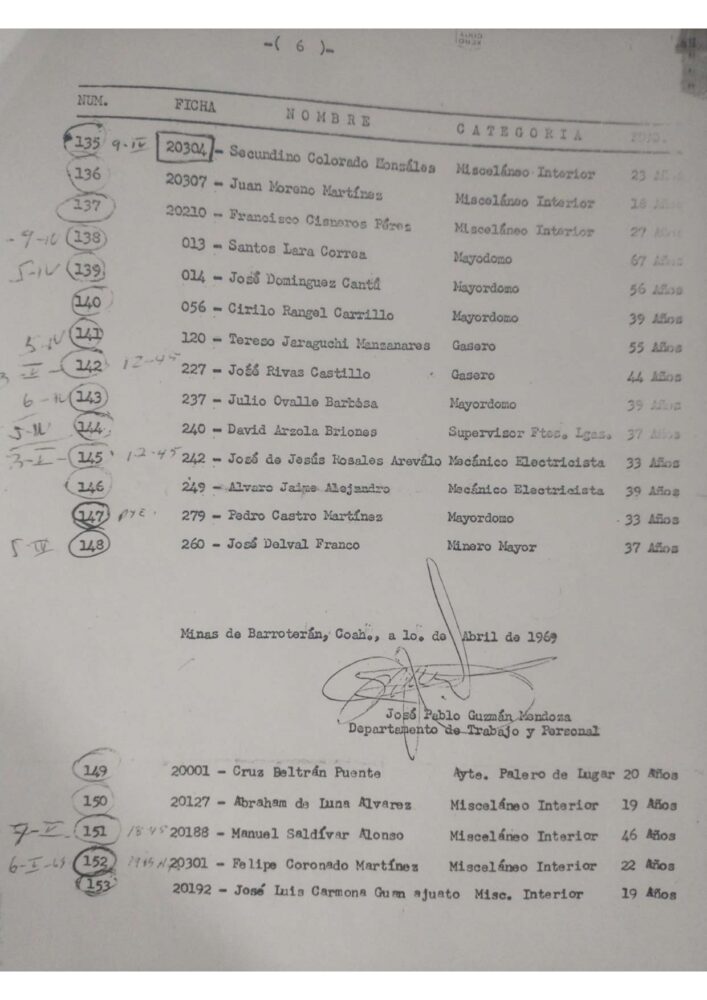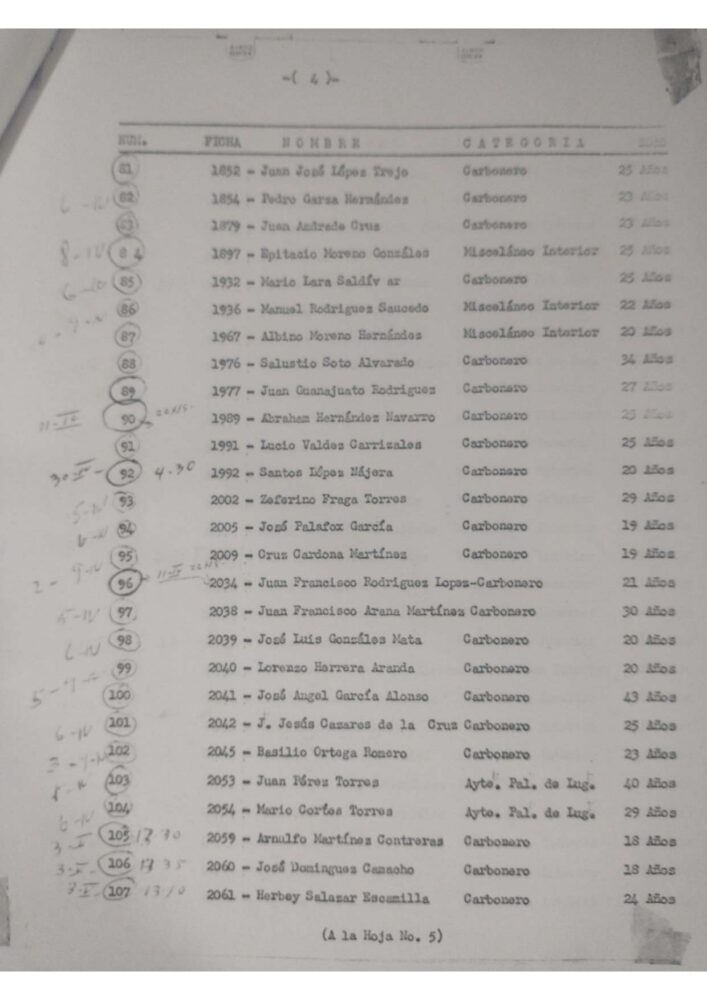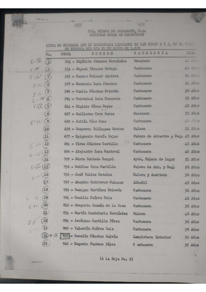 Lista de trabajadores que se encontraban dentro de la mina en Barroterán.