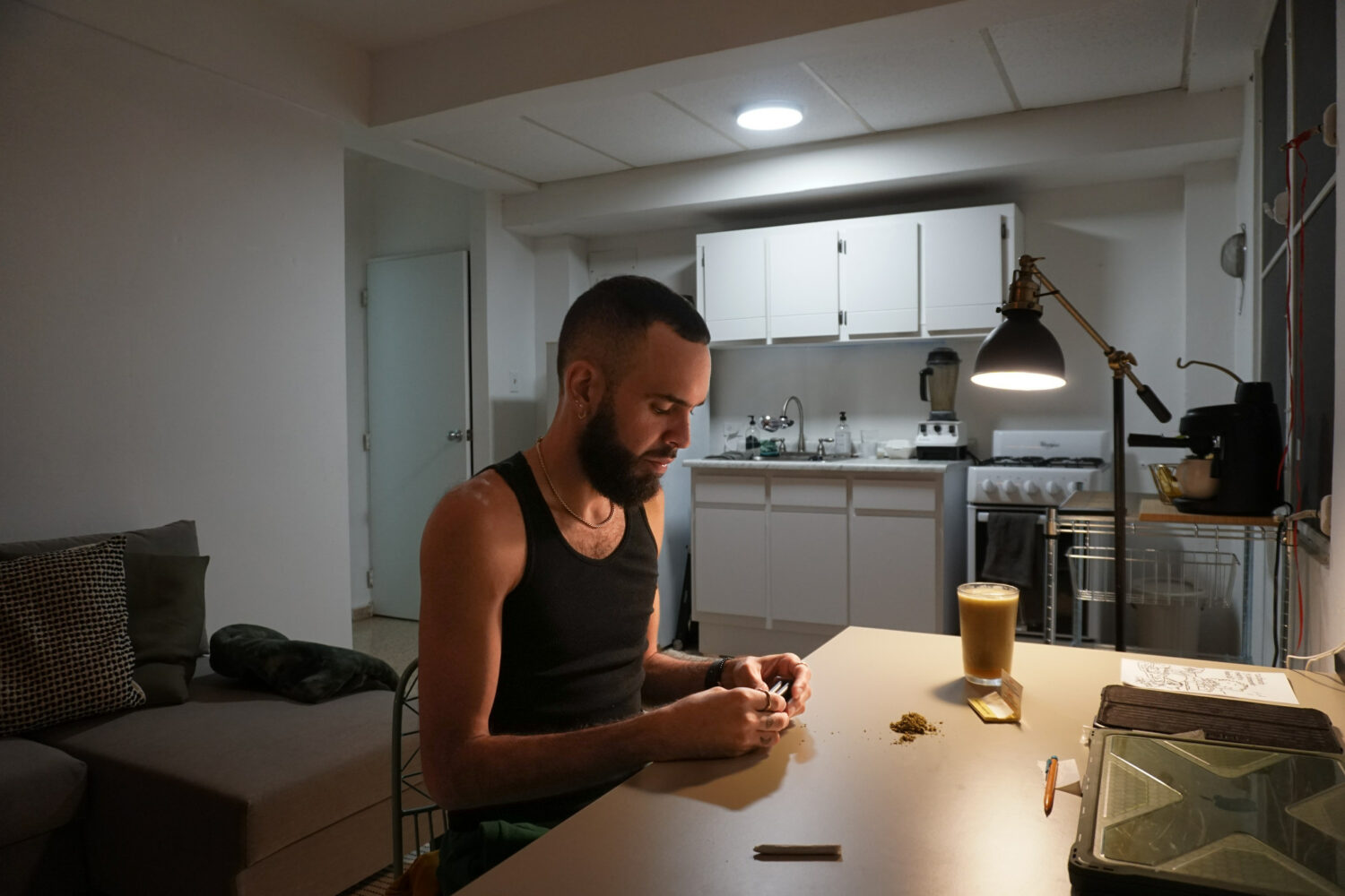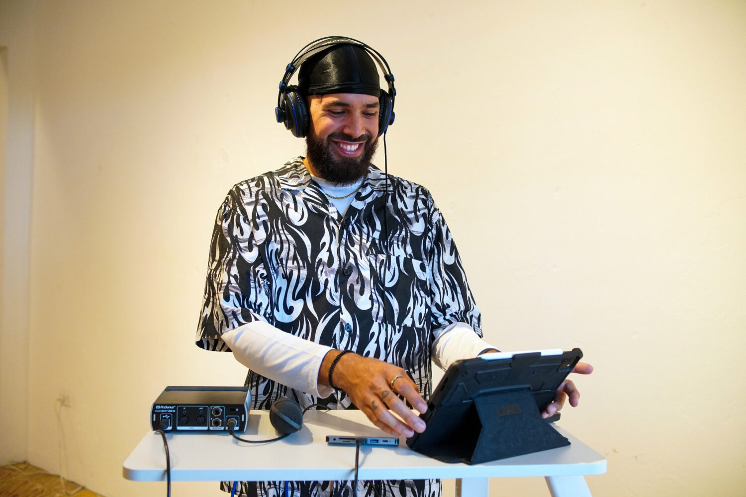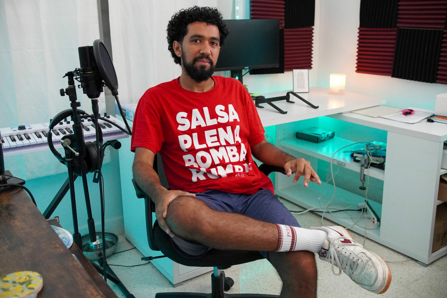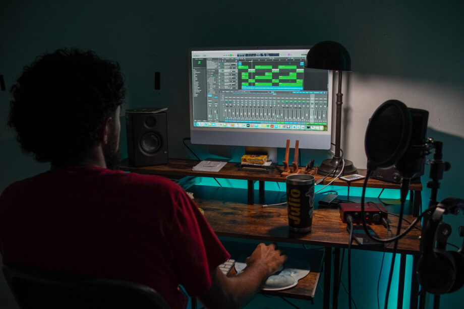 Otros artistas también se adaptan para reducir gastos. A Julio del Hoyo solo le basta caminar unos pasos desde su habitación para llegar a su estudio, un cuarto iluminado con pequeñas luces azules pegadas en las paredes en el barrio Río Piedras de la capital. Es ahí donde se entrega a su música. “Un estudio de la industria es de otra calidad, pero me cobran por hora. Aquí también puede sonar bien y no dependo de otra persona”, dice.