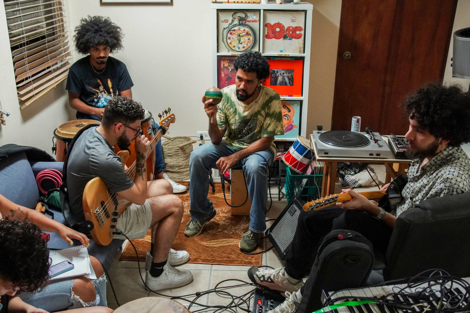 Julio del Hoyo y parte de la banda Las Quenepas, Aurelio Adasme (guitarra), Daniel Muñoz (congas), Javier Tirado (bajo), durante un ensayo en Río Piedras, Puerto Rico.