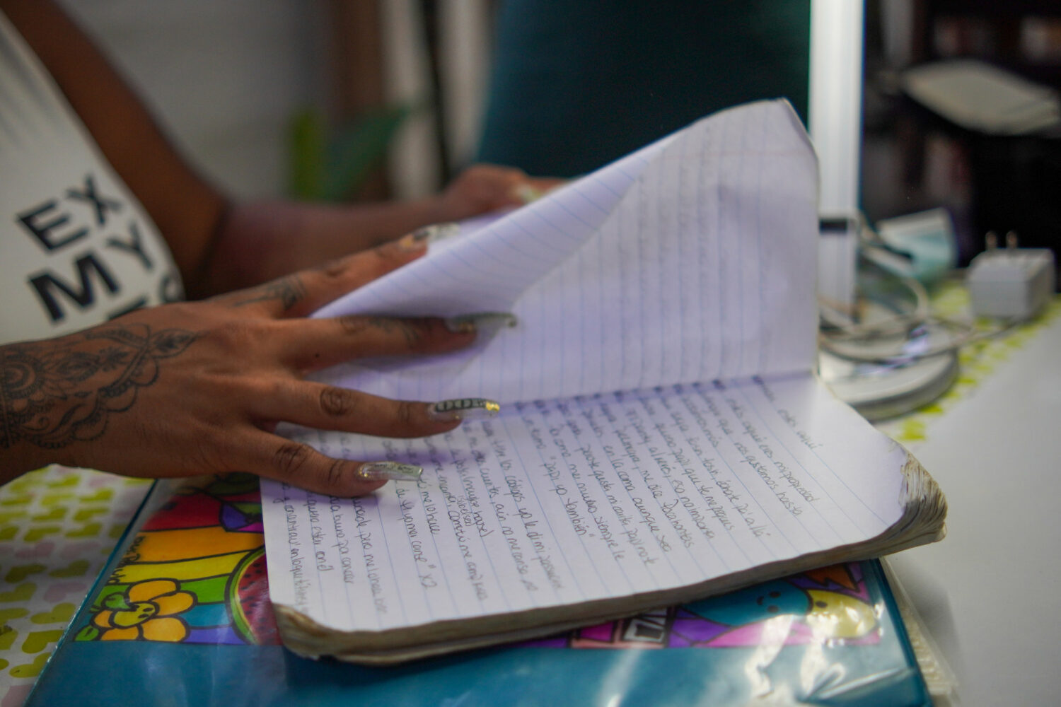 Baby Pau revisa canciones y notas en su libreta de canciones de la adolescencia que aún guarda consigo en Carolina, Puerto Rico.