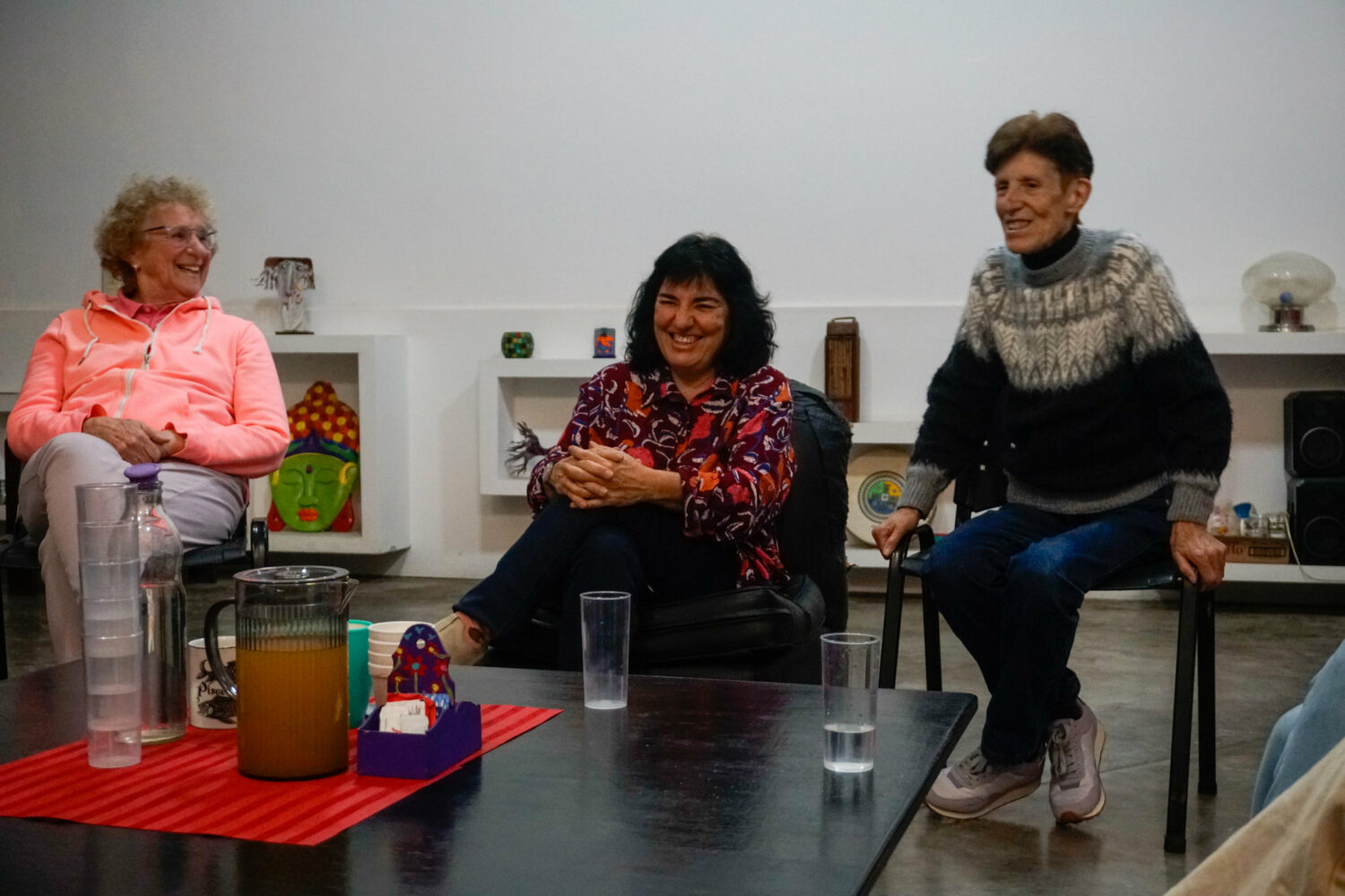 Mirta Alterman, de rosa, Graciela Balestra, blusa floreada, y Ana Barrera, negro y gris, ríen durante un taller de reflexión para mujeres lesbianas en Puerta Abierta a la Diversidad, en la Ciudad de Buenos Aires, Argentina.