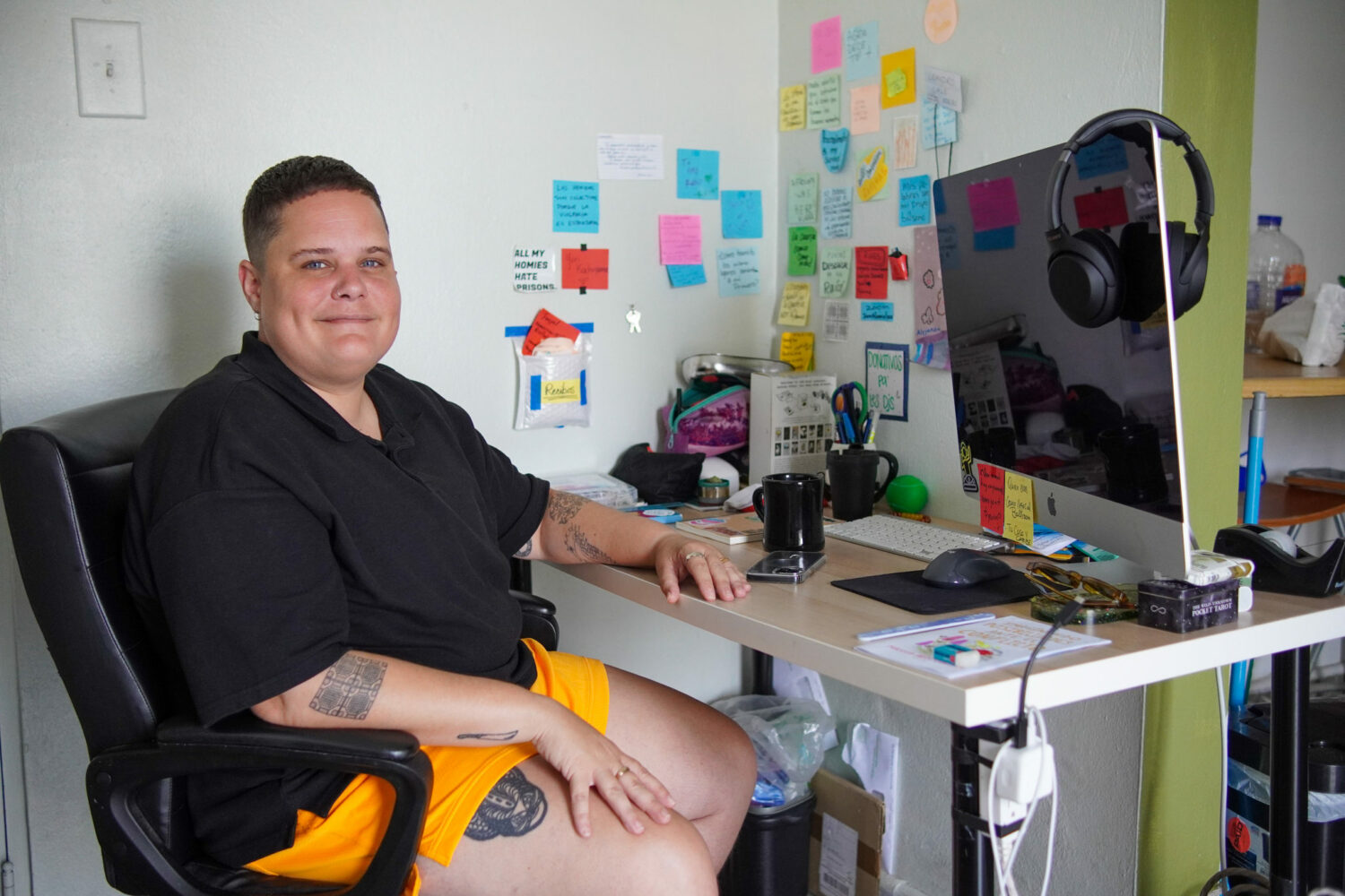 Leandro “Lale” Namerrow, cofundador de la Red Transmasc de Puerto Rico, una iniciativa de apoyo para hombres trans y no binarios, posa para un retrato en su casa en Río Piedras, Puerto Rico. Tras el paso del huracán Fiona en 2022, él y otros compañeros abrieron el chat grupal por WhatsApp.