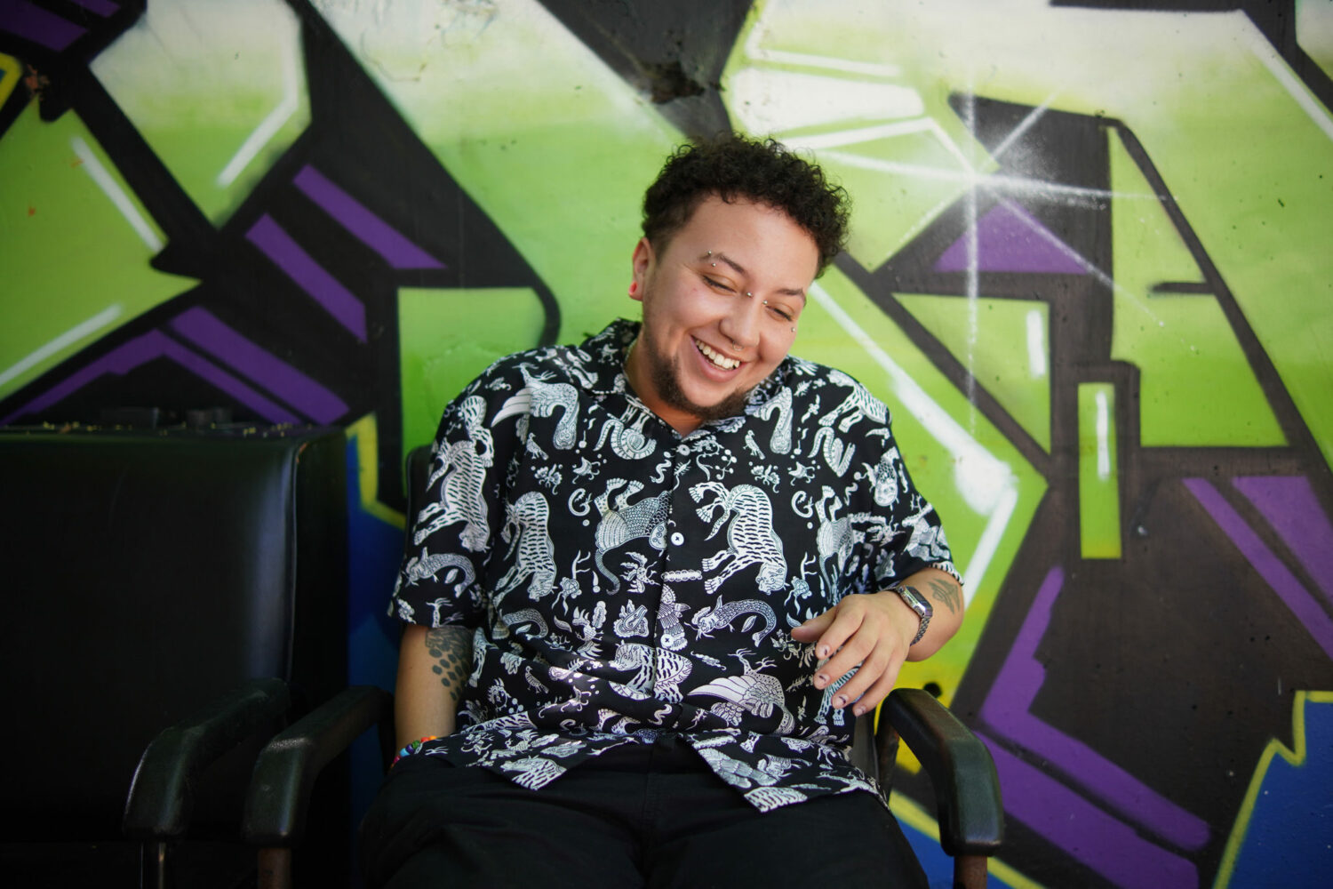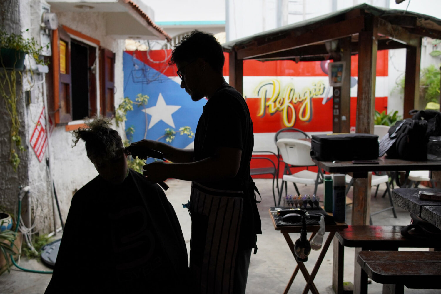 Wyatt Damián De Jesús Casanova recorta a Gabriel Negrón en Río Piedras, Puerto Rico. De Jesús es barbero y procura crear un espacio seguro para recortar a personas transmasculinas. Usualmente se anuncia por el chat.