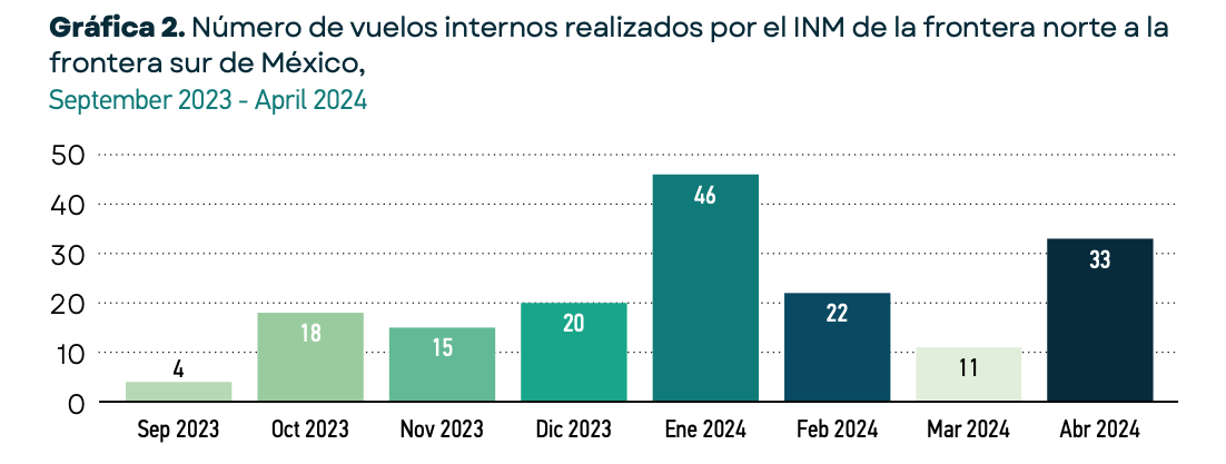 En el año 2023, el INM “trasladó aproximadamente a 47 mil 260 personas, de las cuales 25% fueron mujeres, 4% niñez y 71% hombres.” En abril de este año trasladó aproximadamente a “12 mil 099 personas, de las cuales 27% fueron mujeres, 10% niñez y 63% hombres”.