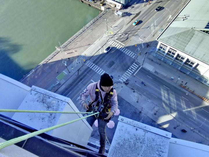 As a rope access worker, Franco has to clean windows on buildings while rappelling down at least 10 metres. He puts his life hanging on a rope tie on a safe port in a building. Rope access is one of the national occupations required in Canada. This means, a person who works in this area, has more probabilities to apply to a Permanent Residence or PR.