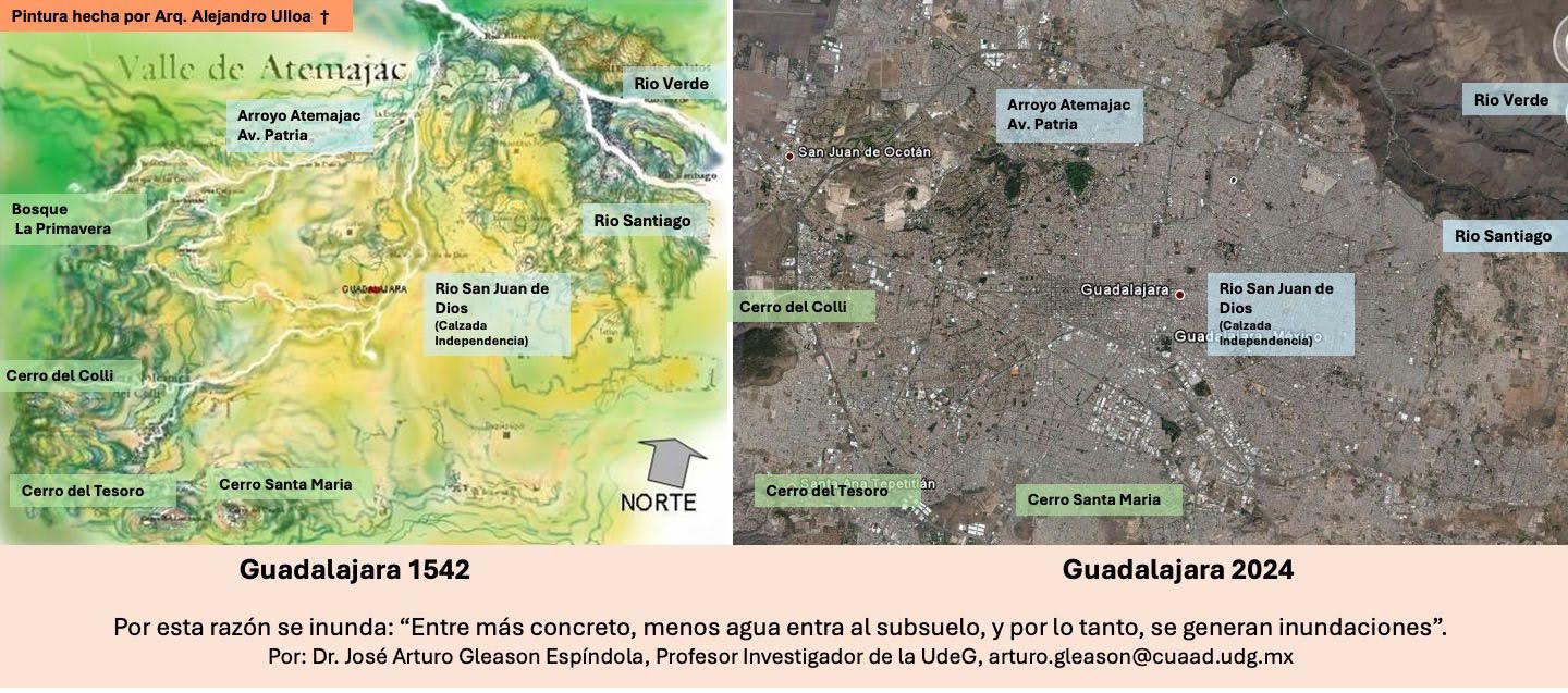El AMG se encuentra asentada en tres valles o cuencas, visto desde el punto de vista hidrológico, estas principales cuencas se ubican en la zona de Tesistán, la zona centro del valle de Atemajac y el valle del ahogado, ubicado a un lado del Aeropuerto Internacional de Guadalajara; sin embargo, gran parte de estos lugares de absorción se han llenado de concreto, “lo que impide que el agua se infiltre y se genere un escurrimiento o flujo de agua que tiene que salir”, precisa el experto en agua de la Universidad de Guadalajara, Arturo Gleason.