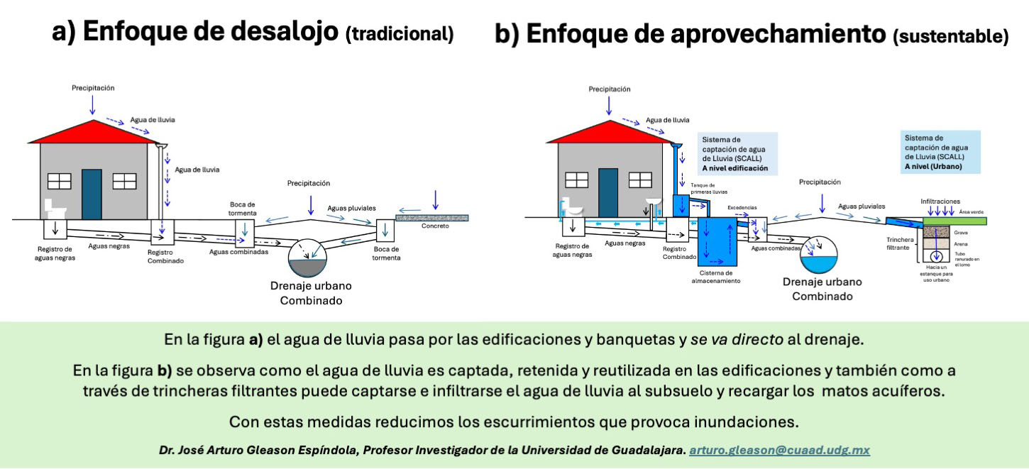 Para el investigador, Arturo Gleason, una posible solución a estas problemáticas es captar el agua de lluvia, pues al hacerlo se podría no sólo abastecer a los hogares del AMG, sino también se podrían reducir las inundaciones.